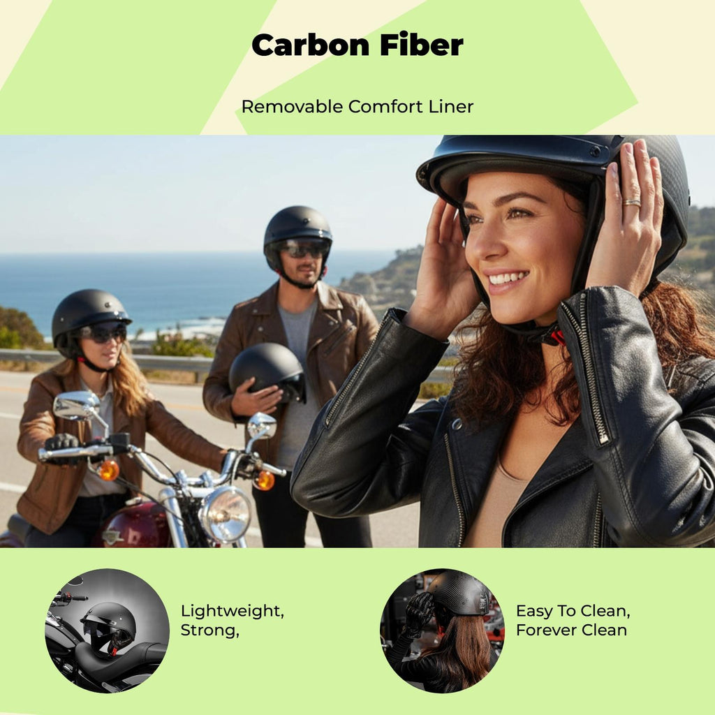 Carbon Fiber Retro Half Helmet for Men and Women: Combining carbon fiber construction, retro styling, and a lightweight design, this helmet provides comfortable protection for urban riding, cruising, and long-distance travel. Lightweight and Comfortable: The extremelylightweight build with a breathable, removable, and cleanable lining ensures comfort in every season, making it suitable for both summer and winter rides. Easy-Release Buckle & Certification: Equipped with an easy-release buckle for convenience and a firm-fit, along with certification for dependable protection during motorcycle riding. Adaptable for Multiple Riding Scenarios: perfect for urban roads, touring motorcycles, and travel, this helmet delivers collision and head protection for both men and women. Sturdy and Practical Design: robust, collision-resistant carbon fiber and sand-blocking features enhance the helmet’s strength and practicality for common use.