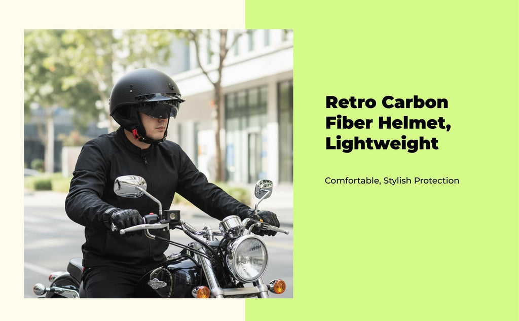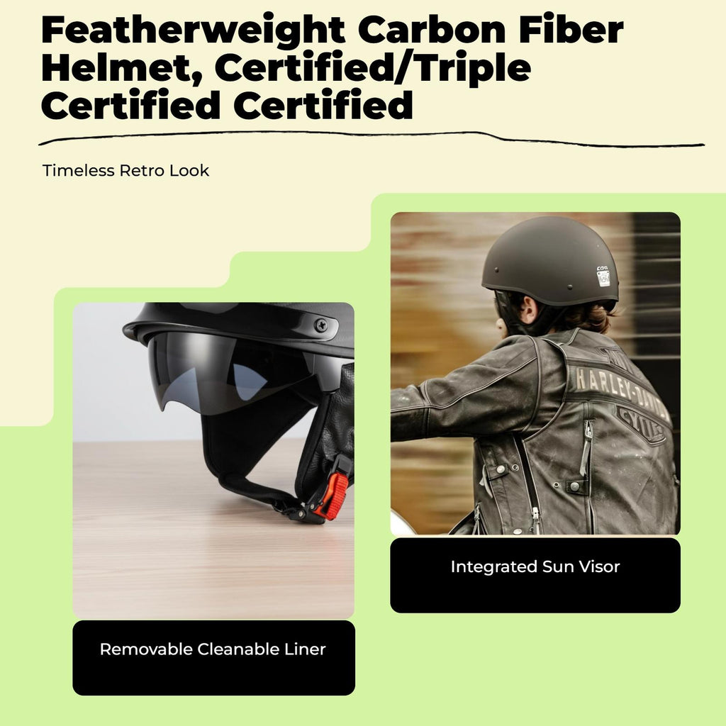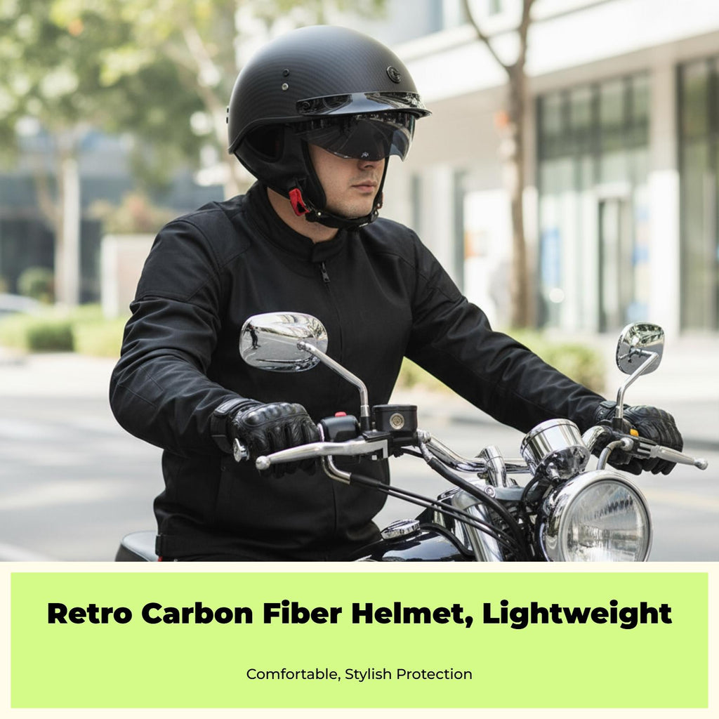 Carbon Fiber Retro Half Helmet for Men and Women: Combining carbon fiber construction, retro styling, and a lightweight design, this helmet provides comfortable protection for urban riding, cruising, and long-distance travel. Lightweight and Comfortable: The extremelylightweight build with a breathable, removable, and cleanable lining ensures comfort in every season, making it suitable for both summer and winter rides. Easy-Release Buckle & Certification: Equipped with an easy-release buckle for convenience and a firm-fit, along with certification for dependable protection during motorcycle riding. Adaptable for Multiple Riding Scenarios: perfect for urban roads, touring motorcycles, and travel, this helmet delivers collision and head protection for both men and women. Sturdy and Practical Design: robust, collision-resistant carbon fiber and sand-blocking features enhance the helmet’s strength and practicality for common use.Specification: