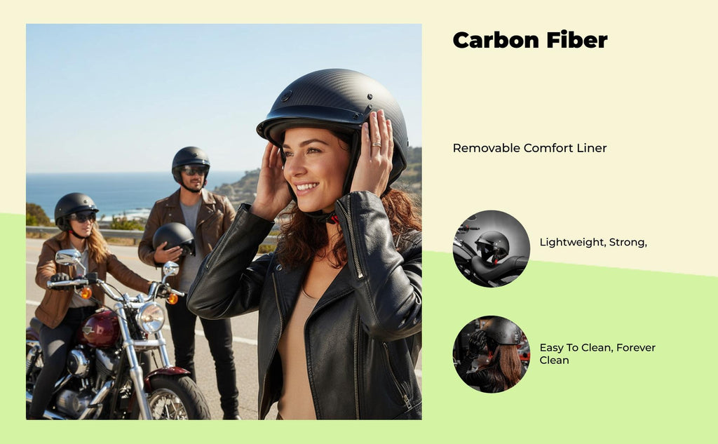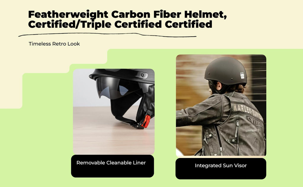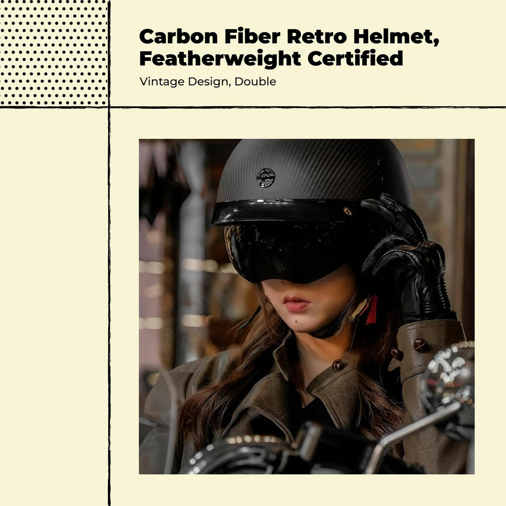 Carbon Fiber Retro Half Helmet for Men and Women: Combining carbon fiber construction, retro styling, and a lightweight design, this helmet provides comfortable protection for urban riding, cruising, and long-distance travel. Lightweight and Comfortable: The extremelylightweight build with a breathable, removable, and cleanable lining ensures comfort in every season, making it suitable for both summer and winter rides. Easy-Release Buckle & Certification: Equipped with an easy-release buckle for convenience and a firm-fit, along with certification for dependable protection during motorcycle riding. Adaptable for Multiple Riding Scenarios: perfect for urban roads, touring motorcycles, and travel, this helmet delivers collision and head protection for both men and women. Sturdy and Practical Design: robust, collision-resistant carbon fiber and sand-blocking features enhance the helmet’s strength and practicality for common use.