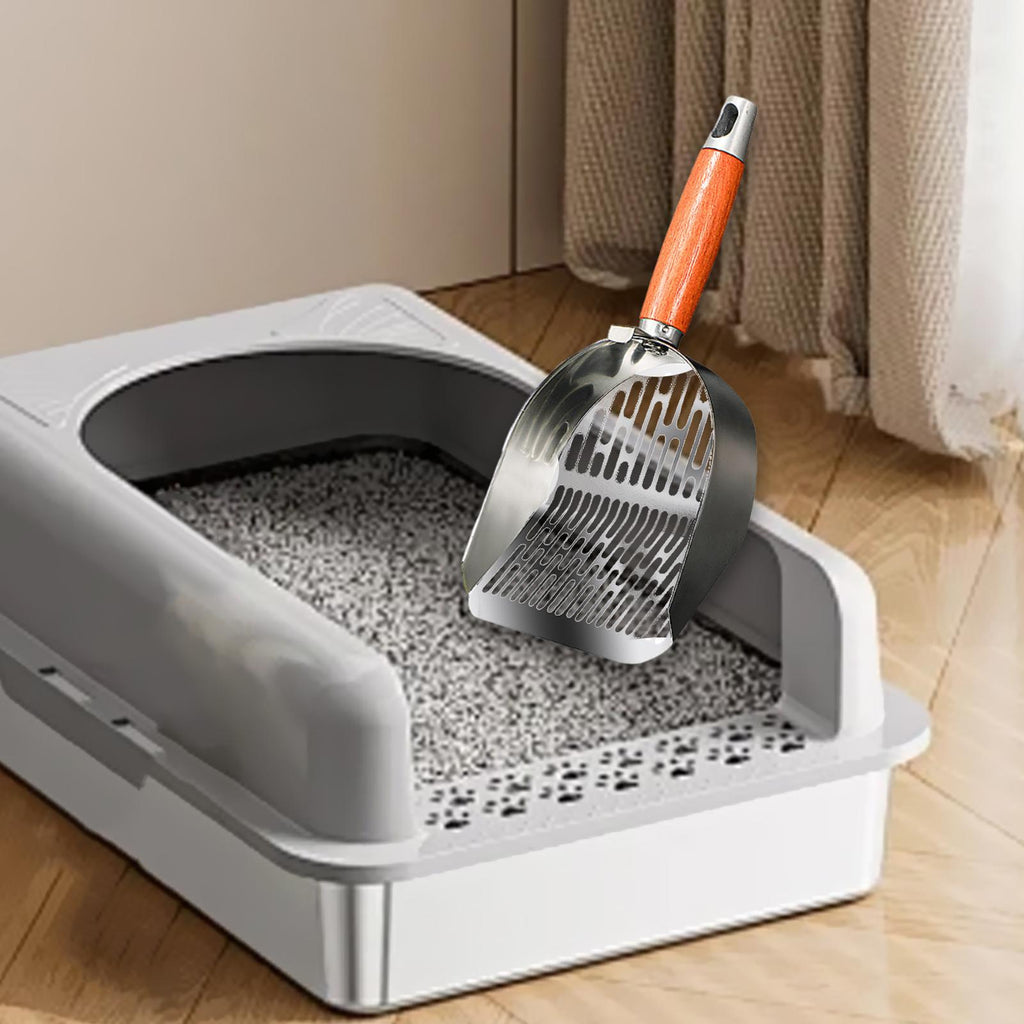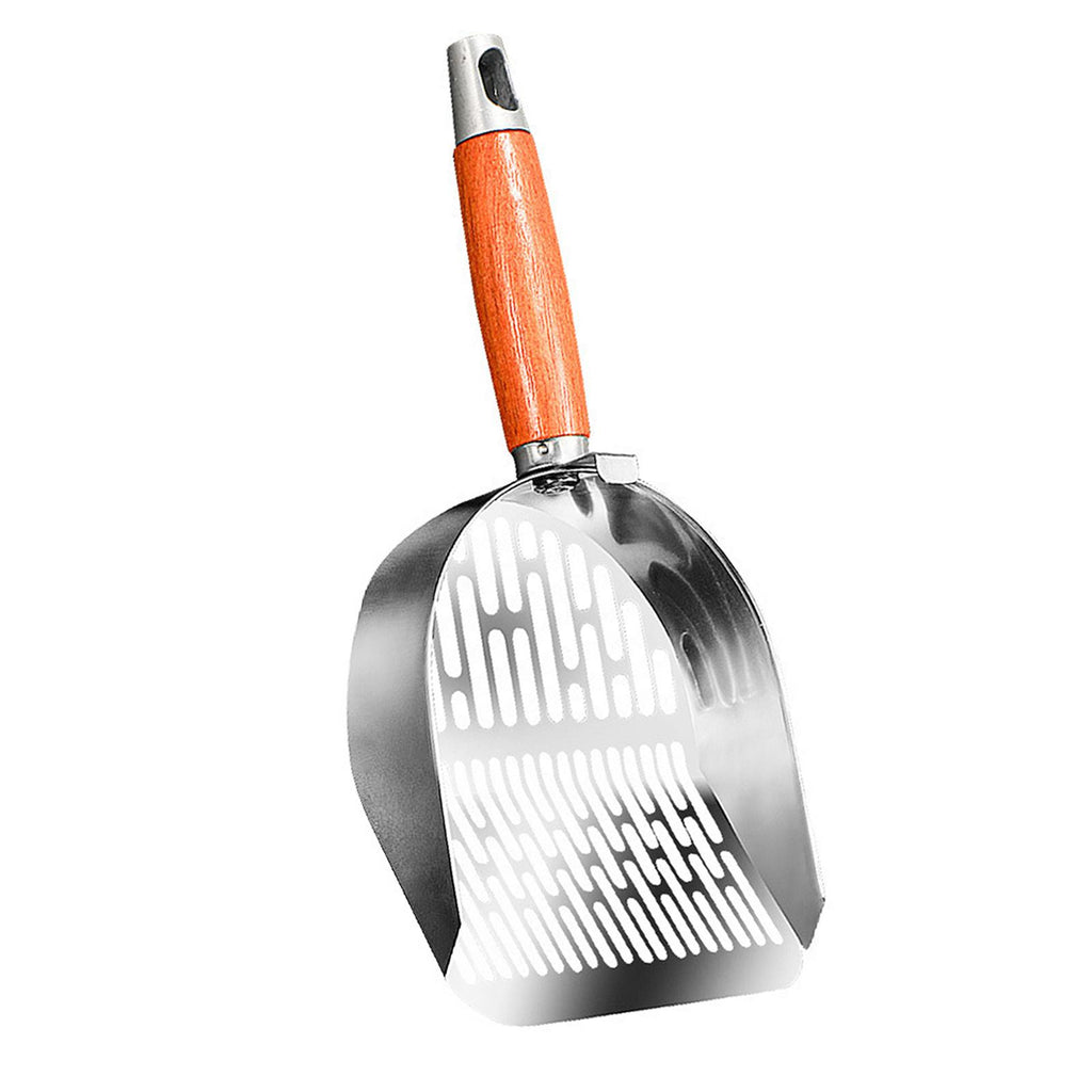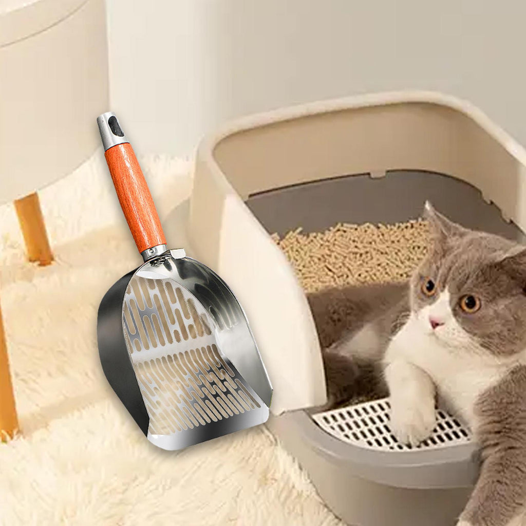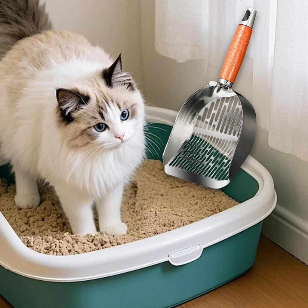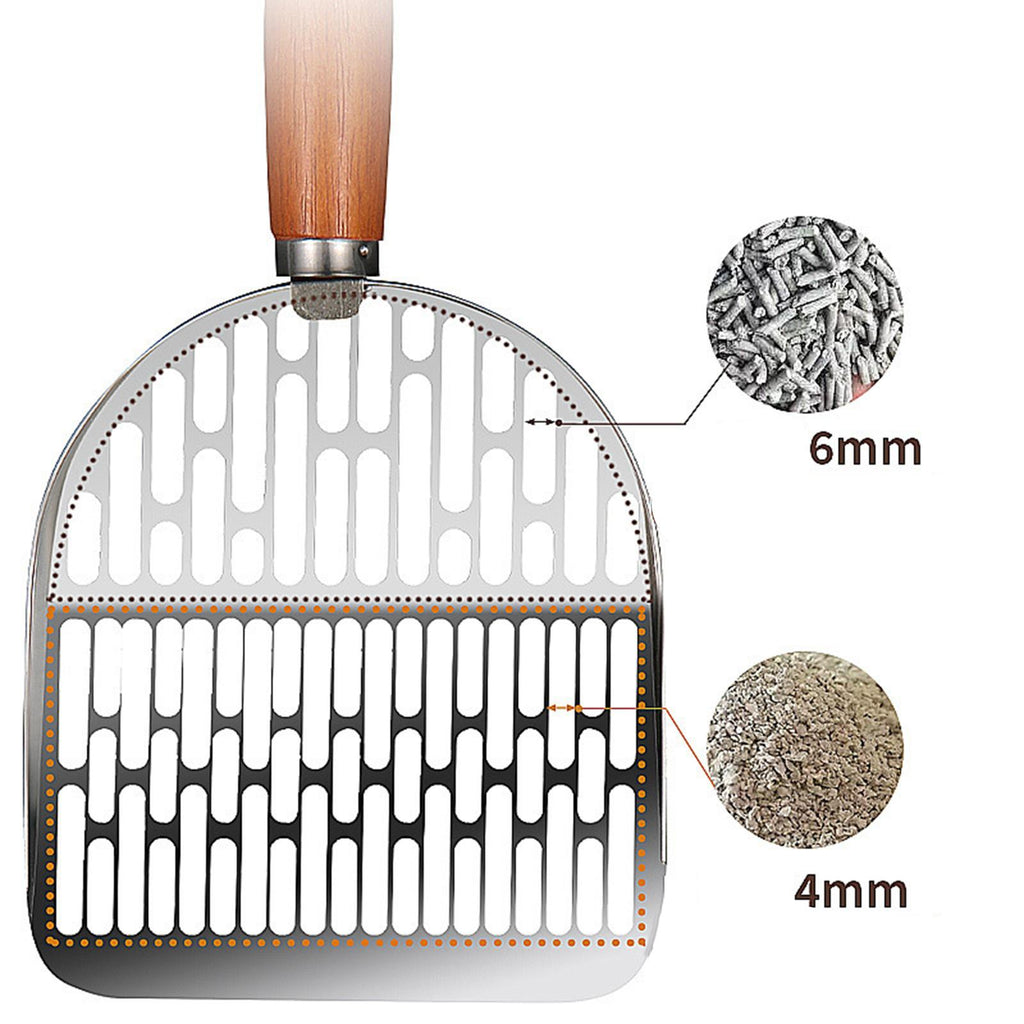 【Premium Material】: Crafted from quality 201 stainless steel, this cat litter spoon is designed to resist rust and provide long term durability. The wood handle offers a refined touch and ensures a comfortable grip during use
