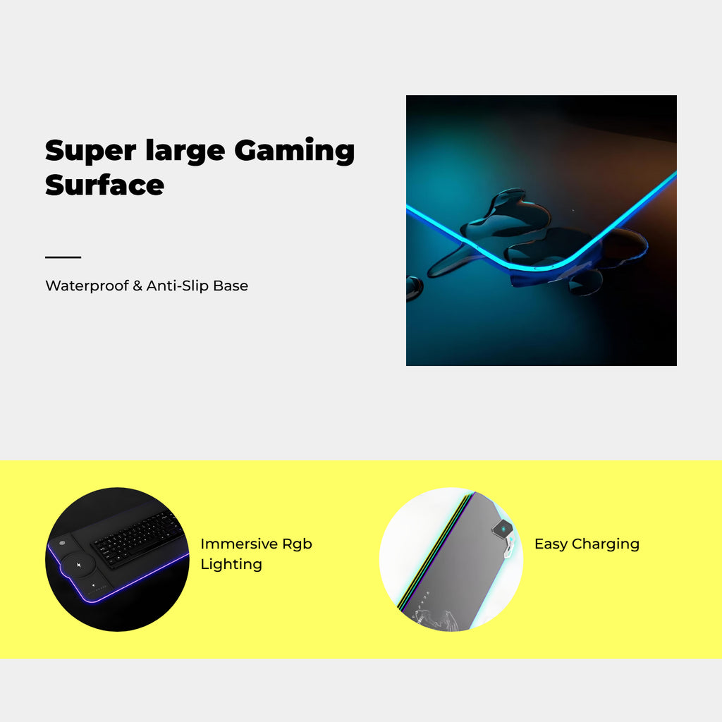 【Charging RGB Pad for Gaming and Office】This large illuminated desk mat features charging capability, luminous RGB lighting, and a non-slip rubber base, making it perfect for gaming setups, workstations, and home offices.【High-Quality and resilient Material】Crafted with a fine-textured surface and a thick rubber base, this pad provides fluid tracking, precise control, and durability for constant use.【Multi-Functional Design for Enhanced Workspace】The additionallarge size accommodates keyboards, laptops, and accessories, helping to keep your desk organized and protected from spills and scratches.【Customizable Lighting Modes】Select from multiple RGB lighting modes to personalize your workspace and create an immersive gaming or working atmosphere.【Easy to Clean and Portable】The waterproof surface allows for effortless cleaning, and the foldable design makes it easy to carry and stash.Specification: