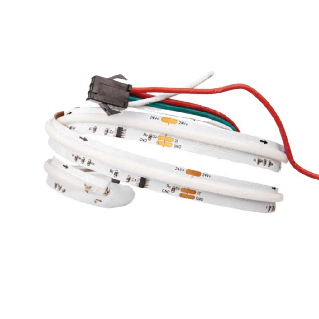 【Adaptable COB Strip Light for Bedroom and Parties】This RGB color-chasing COB strip light features a flexible design and waterproof construction, making it perfect for bedroom decoration, parties, and DIY lighting projects. The lively color effects and addressable chasing modes create an energetic atmosphere for any occasion.【Flexible and Programmable Lighting】Equipped with smart chip technology and app/remote control, this strip offers various modes, adjustable palette, and music sync functions. Easily customize lighting scenes for gaming streams, living rooms, or studio setups.【High-Quality and resilient】Made with high-strength and IP65 waterproof this COB strip light ensures dependable installation and long performance for indoor and outdoor use.【Easy Installation and Wide Application】Perfect for cabinets, walls, kitchens, and gaming rooms, the flexible strip adapts to different surfaces and creative layouts. Great for home décor, offices, and professional photography lighting.【Powerful and Dynamic Color Effects】Powered by DC24V, this strip supports random color-chasing effects and programmable settings, enhancing the atmosphere and lighting versatility for any space.Specification: