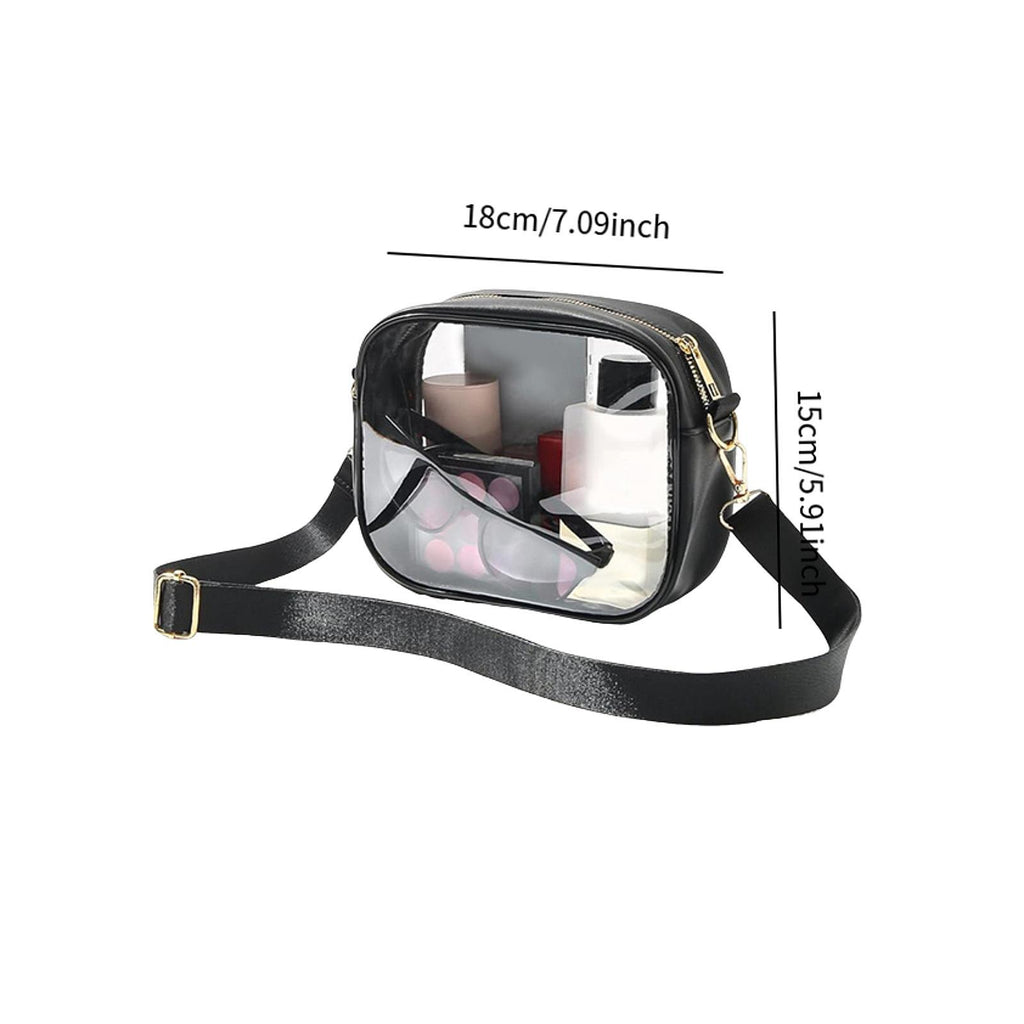 【Compact Dimensions】: Measuring 7.09inchx5.91inchx1.57inch, this transparent bag is compact yet spacious enough to hold all your necessities while maintaining a sleek profile that's easy to carry