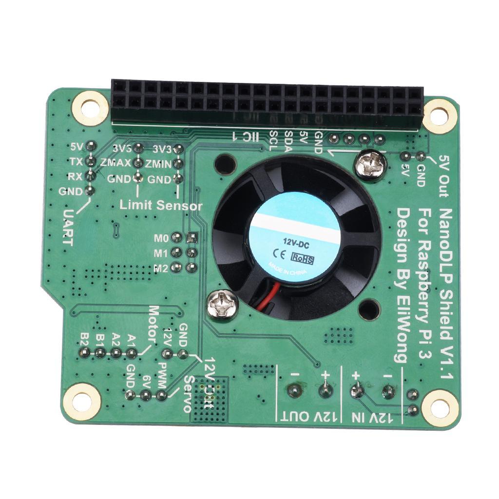 The board contains a 9-28V to 5V circuit, providing up to 3A of current, as well as the required NanoDLP 9V-28V to 5V@3A Buck Converter, DRV8825 Stepper Driver, 12V Fans (cooling the Raspberry Pi).