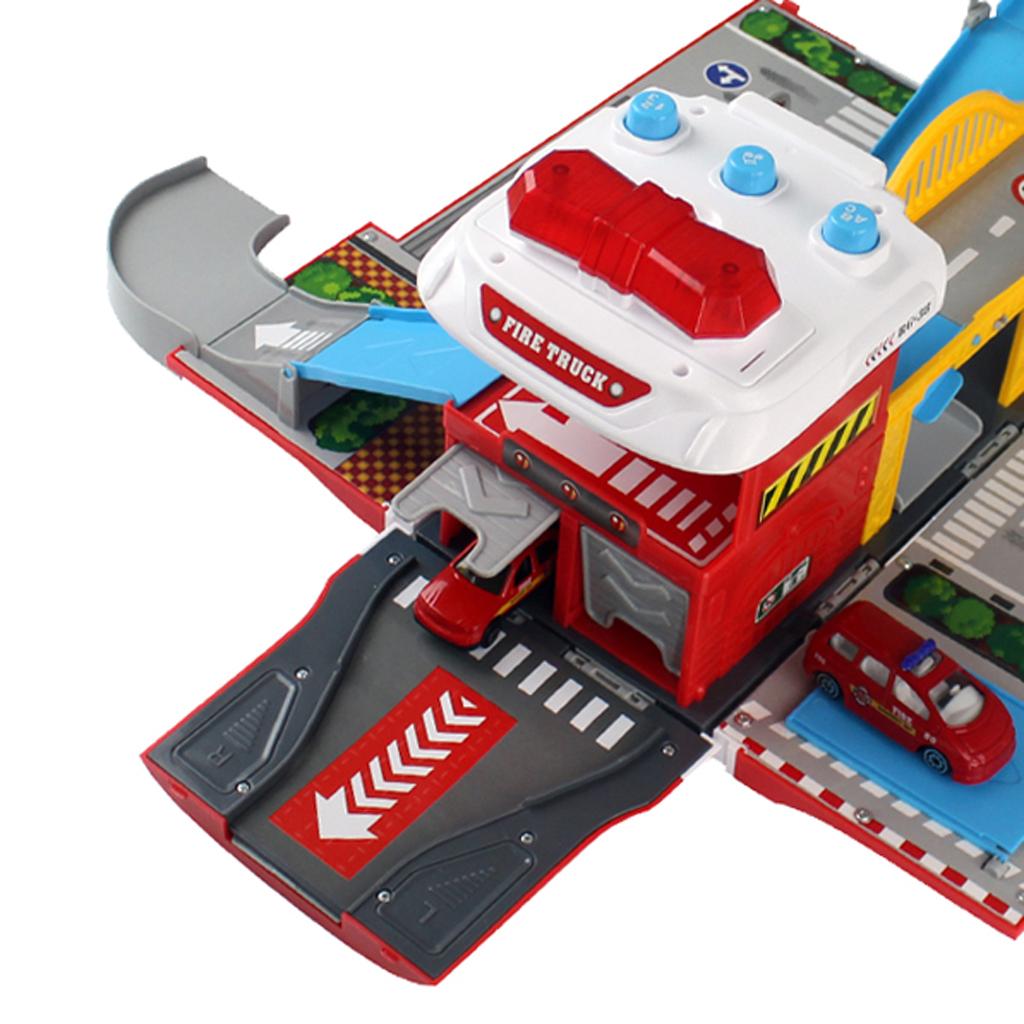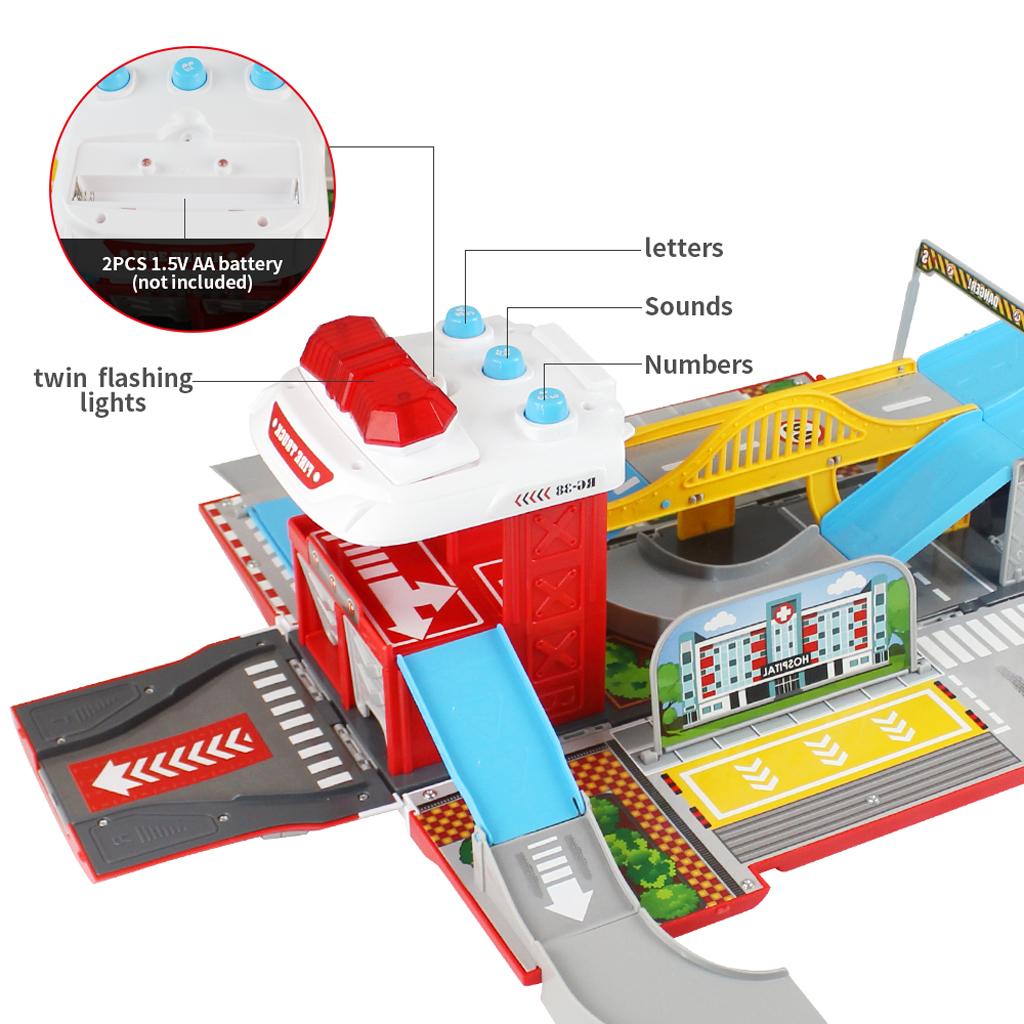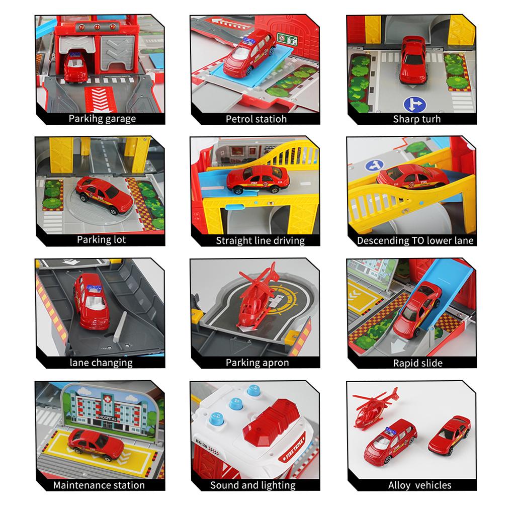 Amazing and cool sound & flash light transforming fire truck racing track & parking lot set brings much fun with your children