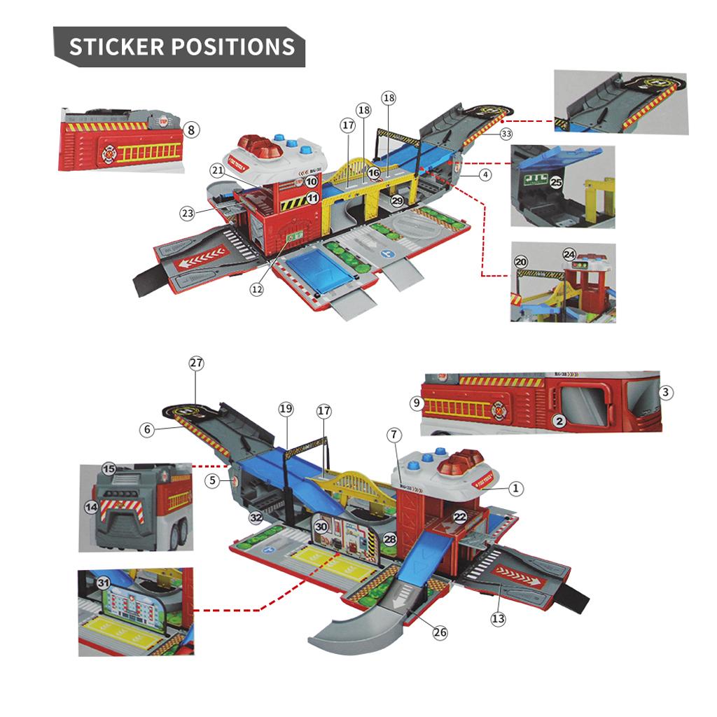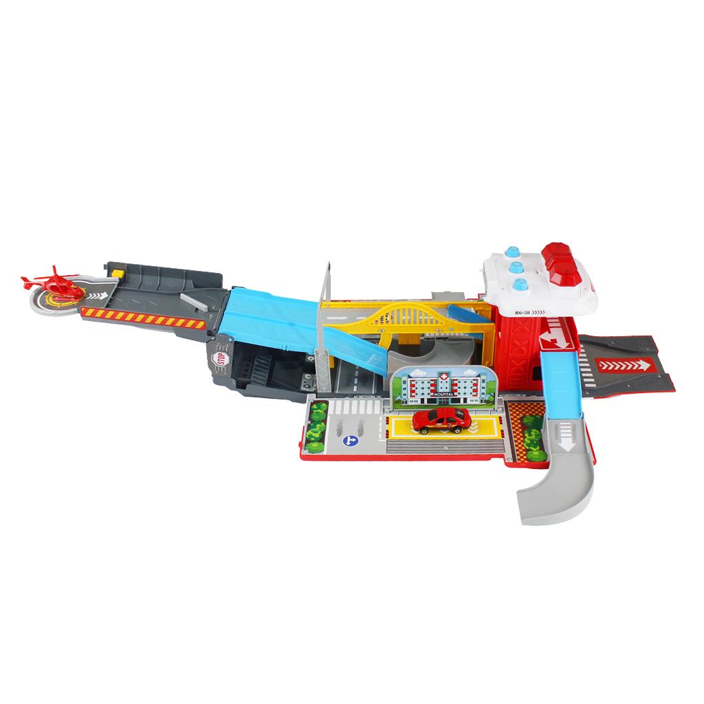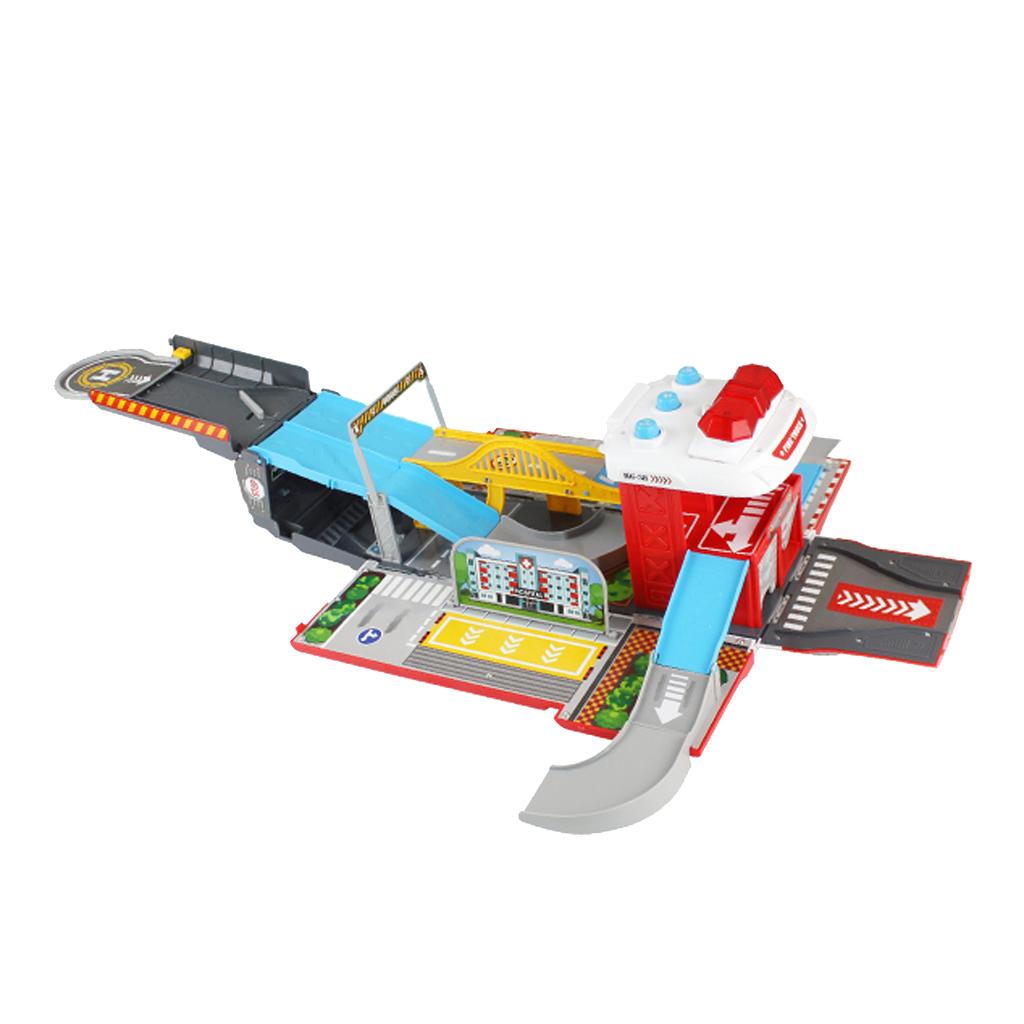 Amazing and cool sound & flash light transforming fire truck racing track & parking lot set brings much fun with your children