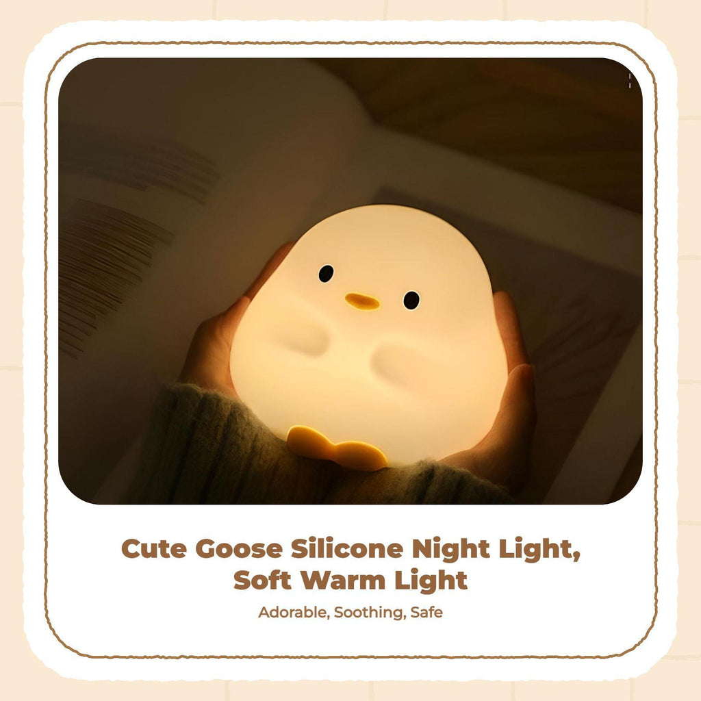 【Dimmable Goose Night Light for Comfortable Ambience】This soft silicone goose night light offers adjustable brightness and a warm light, creating a soothing atmosphere in bedrooms, nurseries, or on bedside tables.【Safe and High-Quality Material】Made from wellnessconscious, food-grade silicone, this light is soft, lightweight, and suitable for children and babies, providing parents with peace of mind.【Rechargeable and Portable Design】With its charging port and portable design, this night light is easy to move, making it perfect for travel, nighttime feedings, or as a decorative accent in any living space.【Tap-Control for Easy Use】The press light function enables simple tap-control to adjust brightness, offering convenience for nighttime use and relaxation assistance.【Versatile Room Décor and Gift Option】perfect for children's rooms, bedrooms, and nurseries, this goose light is a delightful addition to any décor and a thoughtful gift for birthdays or special events.Specification: