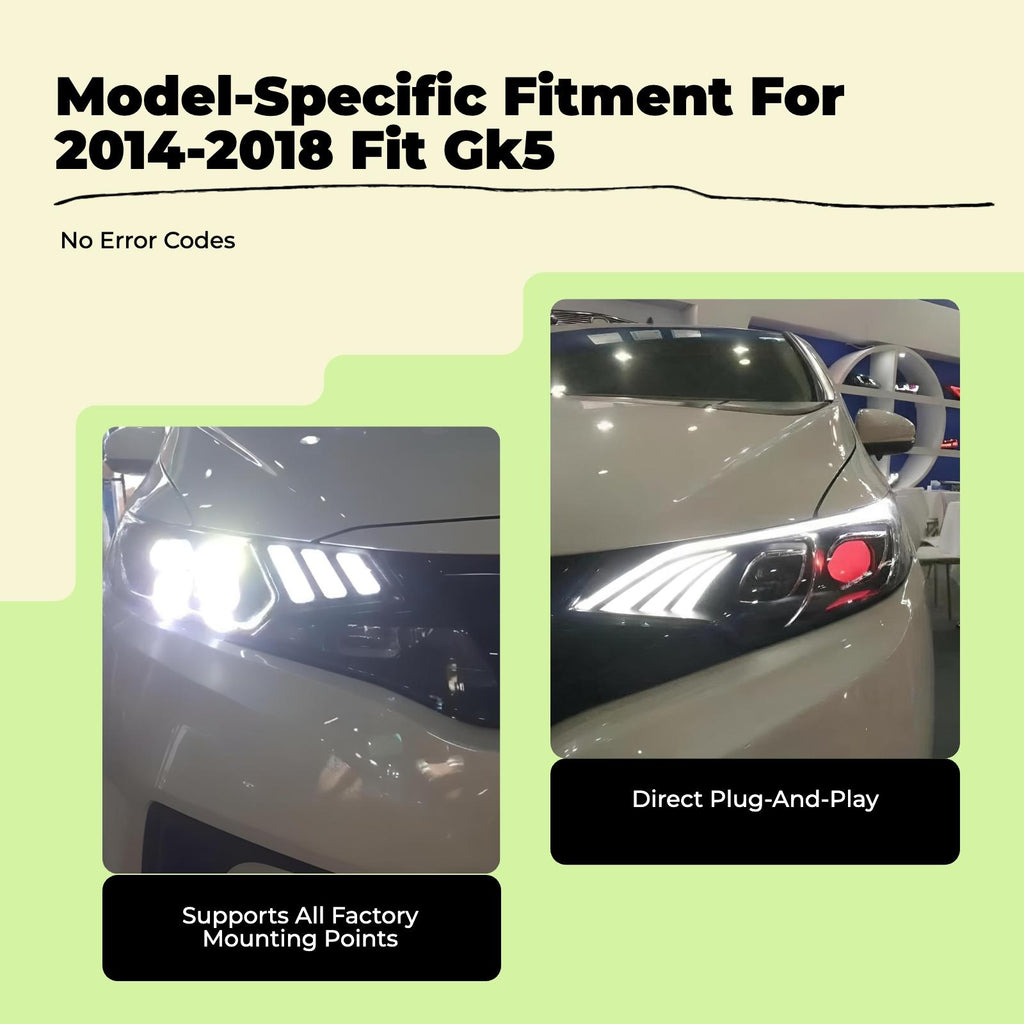[light-emitting diode Headlight Assembly for Fit Model] enhance your 2014-2018 Fit Model with this high-quality light-emitting diode headlight assembly featuring sequential turn indicators and integrated DRL for enhanced visibility and a modern look. [High Brightness and Clear Lens] Equipped with progressive light-emitting diode chips and a clear lens, this assembly provides bright lighting for both high and low beams, improving nighttime driving. [robust and Weatherproof] Built with a housing and IP67 waterproof, these headlamps are made to withstand harsh weather conditions and ensure long performance. [Easy Installation and OEM Fit] The plug-and-play design makes installation easy, offering a for 2014-2018 Fit Model model variant with no visible modifications required. [Enhanced Driving Experience] The sequential yellow turn indicators and light-emitting diode DRL add a stylish accent and improve street visibility, making your vehicle stand prominent while ensuring.Specification: