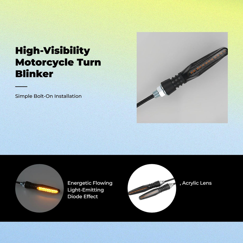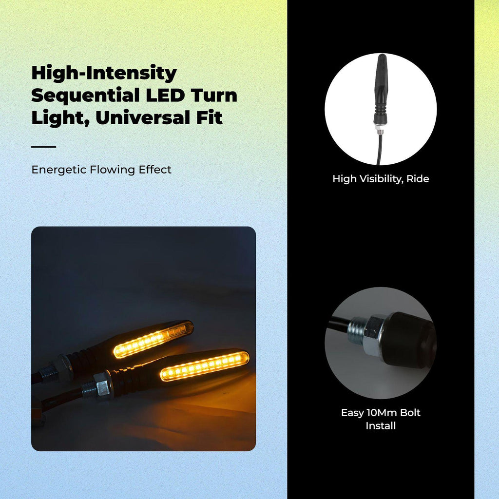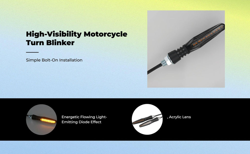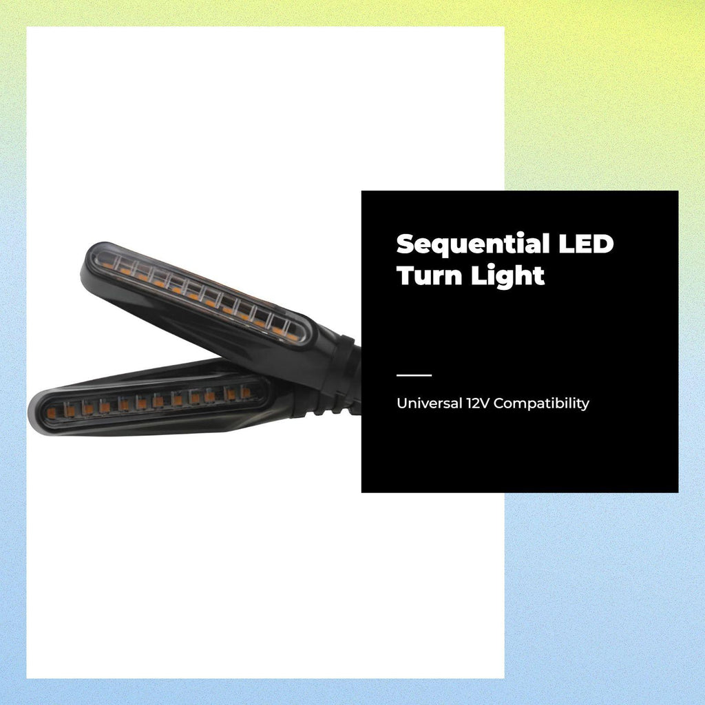 [Light-Emitting Diode Turn marker Light for Motorcycles] This universal 12V light-emitting diode turn marker features a sequential flowing light design, offering bright and clear indicators for enhanced visibility both on the street and on rough terrain. [High-Quality and sturdy] Made from materials, this motorcycle turn marker is built for long performance and reliability in various weather conditions. [Easy Installation, Universal Fit] Designed for straightforward installation, this is compatible with most motorcycles, electric bikes, and scooters, making it a practical enhancement for modification aficionados. [Waterproof and Flexible] With an IP65 waterproof and flexible construction, it ensures stable performance in rain or sunshine, perfect for everyday commuting or adventurous rides. [Practical and Cost-Effective] Combining functionality with high value, this turn marker light is an perfect choice for riders who care about both and design.Specification: