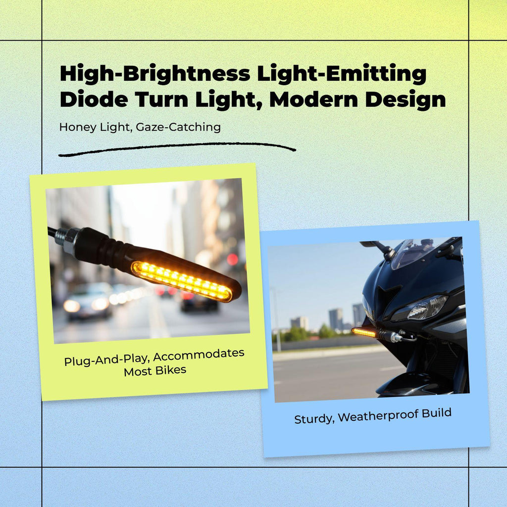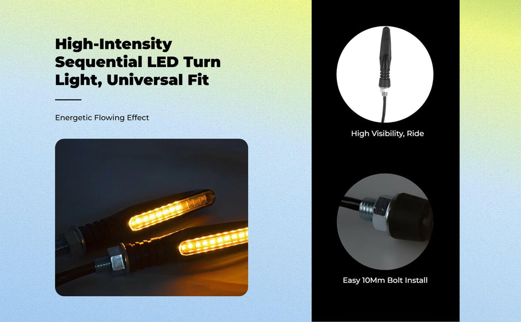 [Light-Emitting Diode Turn marker Light for Motorcycles] This universal 12V light-emitting diode turn marker features a sequential flowing light design, offering bright and clear indicators for enhanced visibility both on the street and on rough terrain. [High-Quality and sturdy] Made from materials, this motorcycle turn marker is built for long performance and reliability in various weather conditions. [Easy Installation, Universal Fit] Designed for straightforward installation, this is compatible with most motorcycles, electric bikes, and scooters, making it a practical enhancement for modification aficionados. [Waterproof and Flexible] With an IP65 waterproof and flexible construction, it ensures stable performance in rain or sunshine, perfect for everyday commuting or adventurous rides. [Practical and Cost-Effective] Combining functionality with high value, this turn marker light is an perfect choice for riders who care about both and design.Specification: