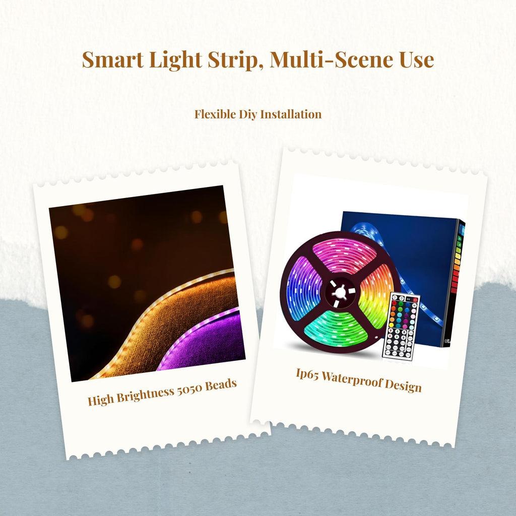 【Smart RGB light-emitting diode Strip Light for Home Decor】This 12V waterproof light-emitting diode strip features dynamic color changing, smart remote control, and automatic backing, making it perfect for bedroom, living room, and party lighting.【Flexible Super Bright Lighting】5050 RGB light-emitting diodes provide extremely bright and flexible lighting for indoor and outdoor decoration, including garden, balcony, and TV backlighting.【Easy Installation & DIY Control】The automatic design enables quick setup on any surface, offering DIY multi-color choices and segmented color control for personalized room lighting.【Music Sync & Timer Setting】Enjoy music mode and timer function for dynamic lighting effects, perfect for festivals, holidays, and birthday gifts.【robust】Low-power, waterproof construction ensures dependable, long performance for all your home DIY lighting projects.Specification: