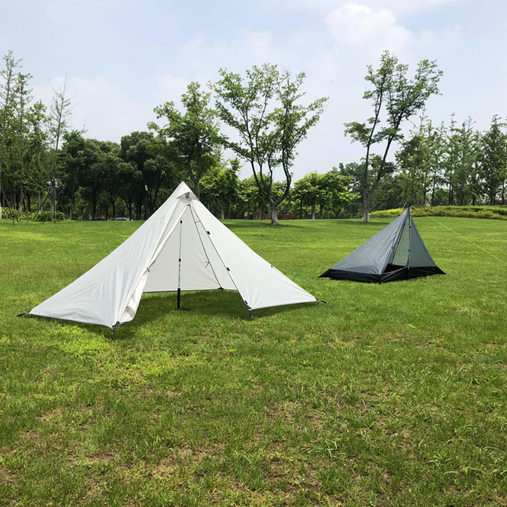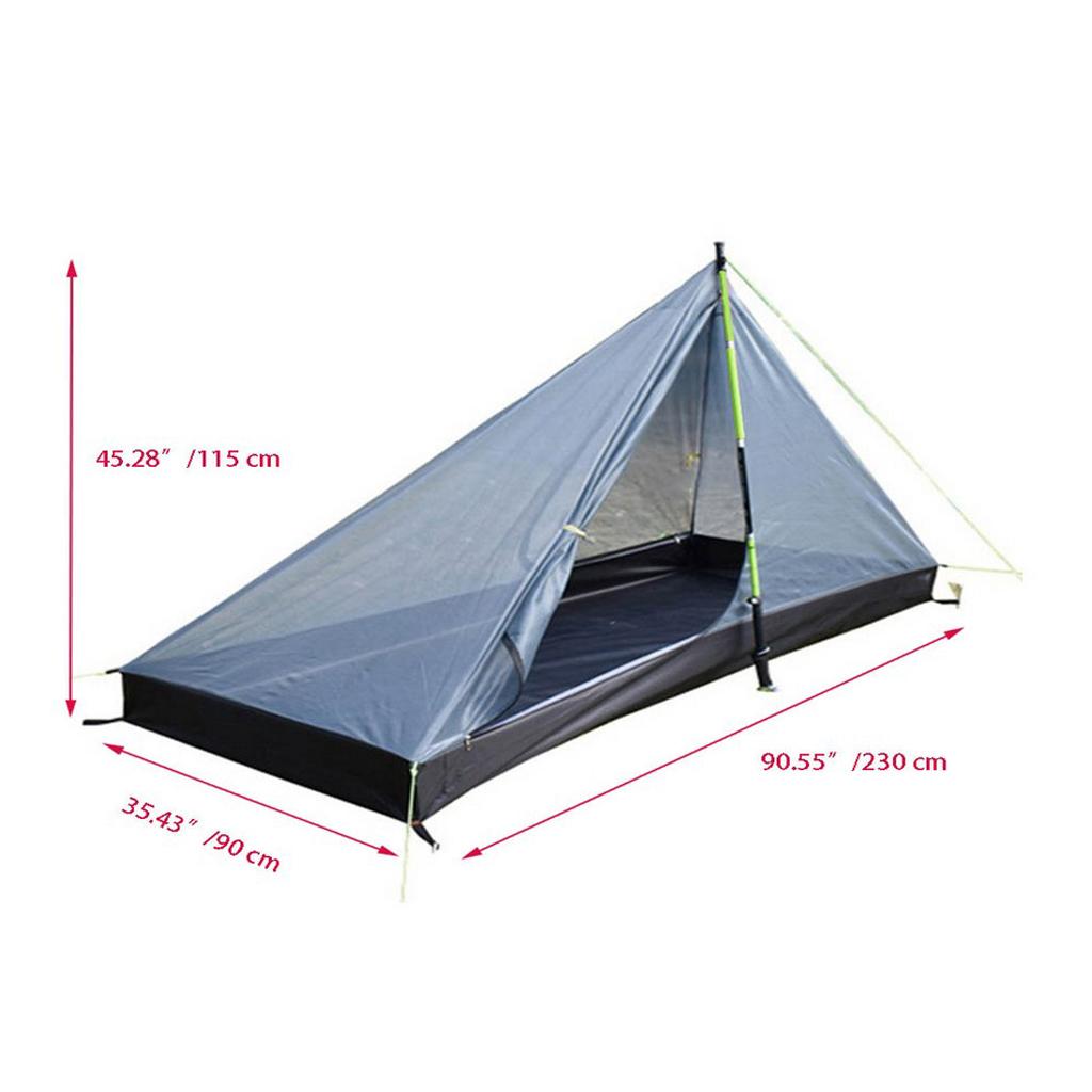 Camping tent is double layers, includes two parts: outer tent tarp rain fly and inner mosquito net canopy, windproof, easy to set up, just one trekking pole or walking stick and hold up the tent easily
