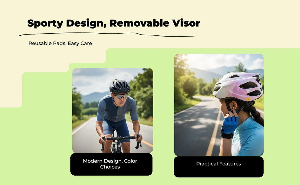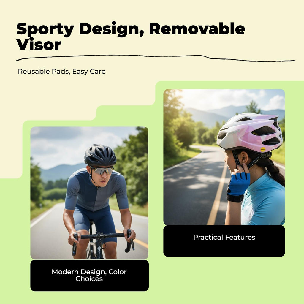 [Lightweight for Adults] This cycling helmet features a lightweight construction, an adjustable fit system, and a removable visor, making it versatile for mountain biking, urban cycling, and everyday commuting. [Adjustable and Comfortable Fit] Equipped with adjustable straps and internal padding, this helmet provides a personalized fit and enhanced comfort for both men and women during extended rides. [Ventilation and Breathability] Designed with multiple air vents and rear exhaust ports, the helmet ensures optimal ventilation, keeping you cool and comfortable. [dependable collision Protection] Made from high-quality expanded polystyrene foam, this helmet offers dependable head protection and effective shock absorption for outdoor activities and cycling. [Universal Design for Multiple Scenarios] Suitable for mountain biking, urban cycling, commuting, and other outdoor activities, this adult helmet is a practical and affordable choice for riders.Specification: