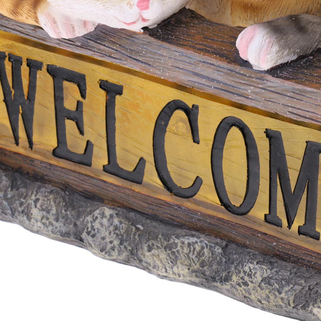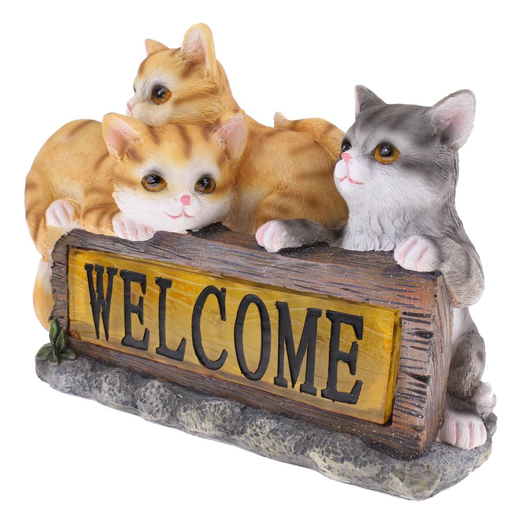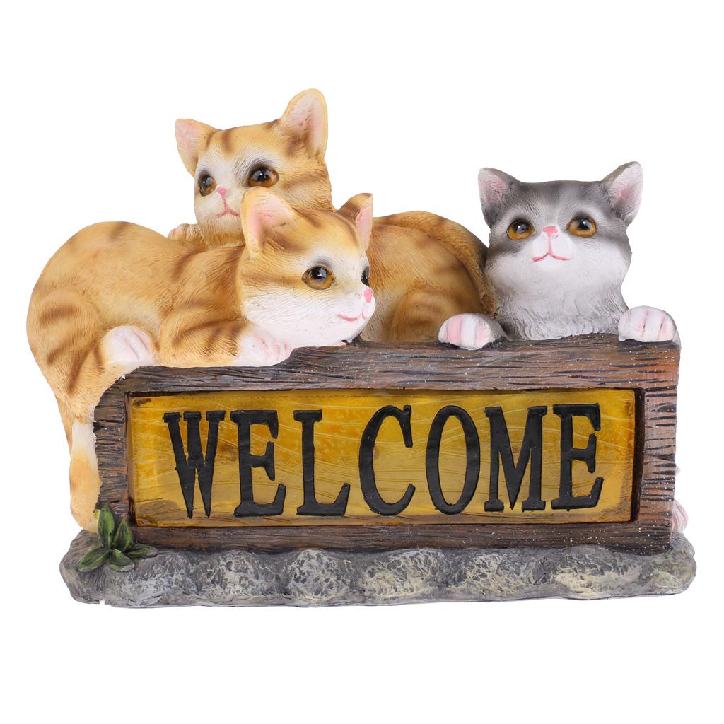A handmade delicated solar energy cat statue(3 cat with "welcome" word); Press the bottom of the light, you can light it in the dark!
