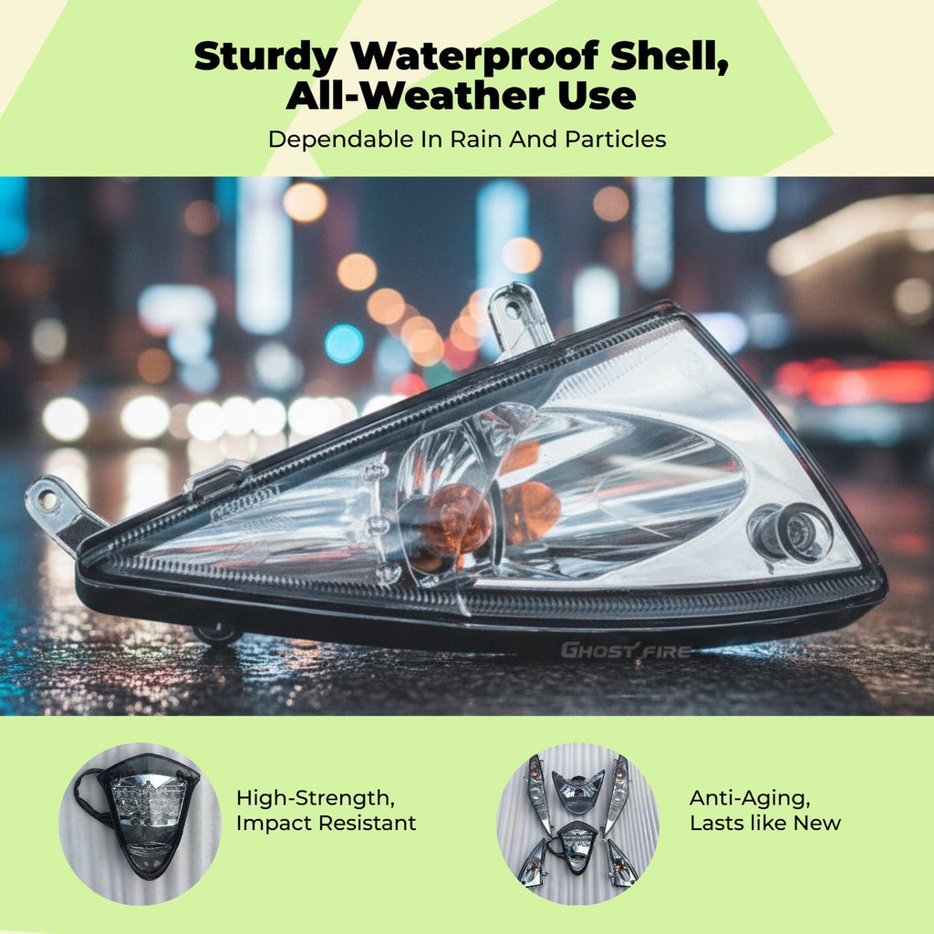 "translated_text": "[Enhanced Visibility and Safety] This motorcycle headlight assembly with integrated light-emitting diode turn indicators delivers clear lighting and improved visibility for nighttime riding and challenging weather conditions. [Sturdy Waterproof Construction] Crafted with a robust ABS housing and waterproof design, this headlight and turn marker set is engineered to endure frequent use and tough environments. [Easy Installation and Universal Fit] Designed for effortless installation, this assembly is compatible with GY6 scooters and similar electric motorcycles, making it perfect for upgrades or replacements. [Energy Efficient and enduring] Low power consumption light-emitting diode lights provide bright, dependable lighting with a long maintenance life, minimizing the need for frequent replacements. [Perfect for Modification and Replacement] perfect for customizing your motorcycle or replacing damaged parts, this assembly enhances both the appearance and functionality of your vehicle."Specification: