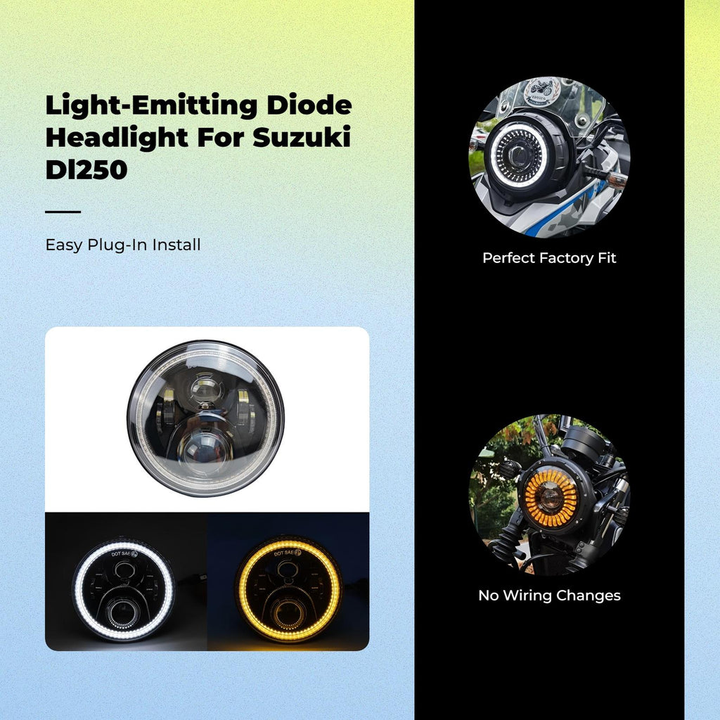【Adaptable Radiant Circles light-emitting diode Headlight Assembly】This motorcycle headlight assembly features radiant circles light-emitting diode projector lenses, designed for the Suzuki DL250 and compatible with various motorcycle styles. It enhances both visibility and aesthetics for common riding and personalized modifications.【High-Quality and Sturdy Materials】Constructed with genuine glass lenses and a resilient housing, this headlight assembly ensures long performance and reliability, making it suitable for frequent use and various weather conditions.【Easy Retrofit and Installation】The assembly supports straightforward installation with minimal modifications, making it perfect for DIY hobbyists and motorcycle repair situations. It integrates smoothly as a or enhancement.【Enhanced Functionality】Equipped with high/low light, daytime visibility running light, and waterproof design, this headlight provides clear lighting and improved for night riding or in adverse weather conditions.【Practical and Cost-Effective Choice】Combining outstanding practicality with great value, this headlight assembly is a smart option for motorcycle customization, maintenance, and common commuting.