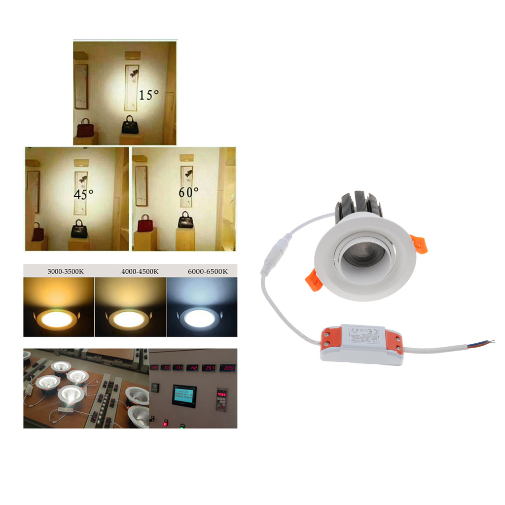 The ceiling spotlight can be adjusted to 15°45°60°. Material: Aluminum, Voltage 85-265V, 50/90HZ, Power: 7W/12W, Emitting Color: White 6000K/ Warm White 3000K,