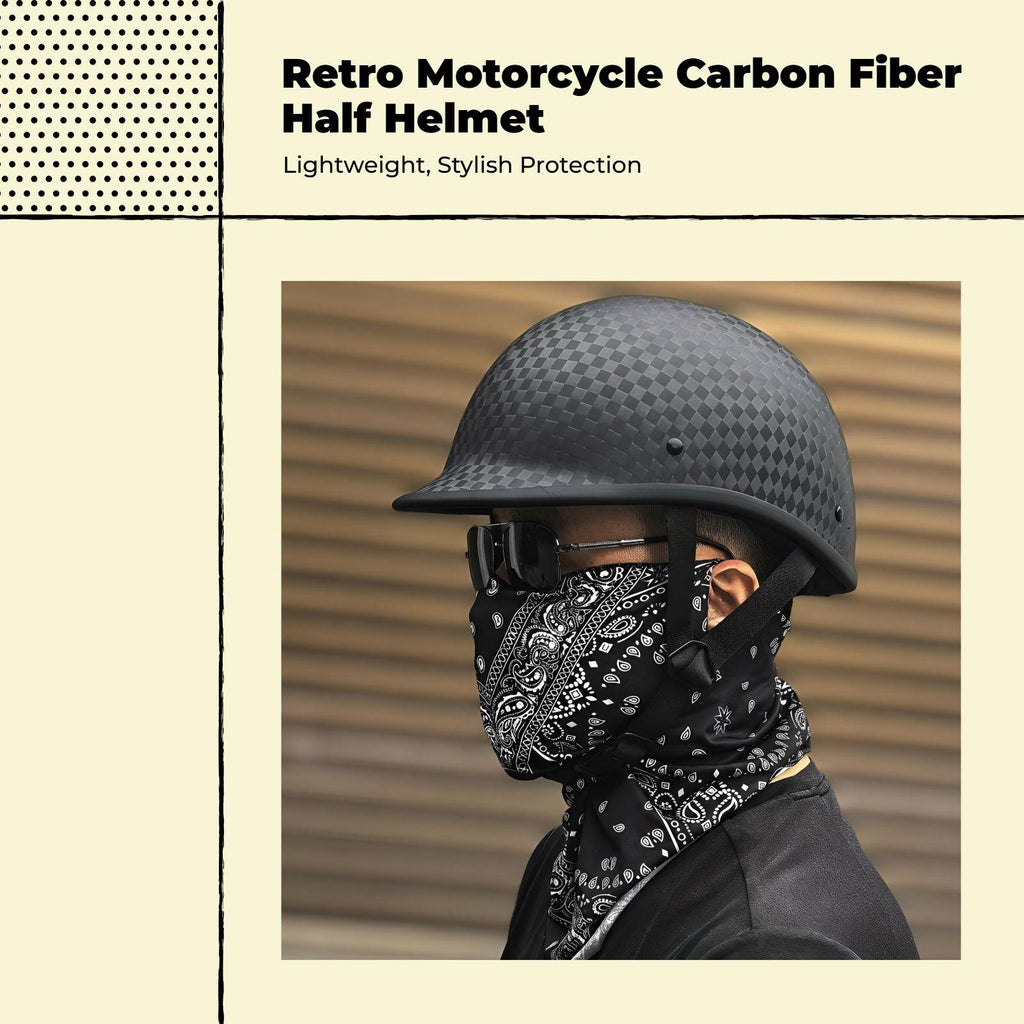 【Retro Carbon Fiber Motorcycle Half Helmet for Safety and Comfort】Combining retro design with sophisticated carbon fiber pattern, this lightweight open face helmet offers dependable protection and comfort for motorcycle riding, urban cruising, and outdoor activities.【Lightweight and Comfortable Fit】Designed for adults, the helmet features a lightweight shell and interior padding for extended wear, making it suitable for long rides and common commuting.【collision and Wind Protection】The helmet provides effective collision protection, windproof and sandproof features, ensuring safety and unobstructed view during various riding conditions.【Adjustable and adaptable Design】Equipped with adjustable straps and fasten buckle, this helmet accommodates different head sizes and is perfect for men and women in all seasons.【High-Quality and Practical Choice】Made with sturdy materials and a stylish carbon fiber pattern, this helmet is a practical choice for motorcycle lovers pursuing security, comfort, and value.