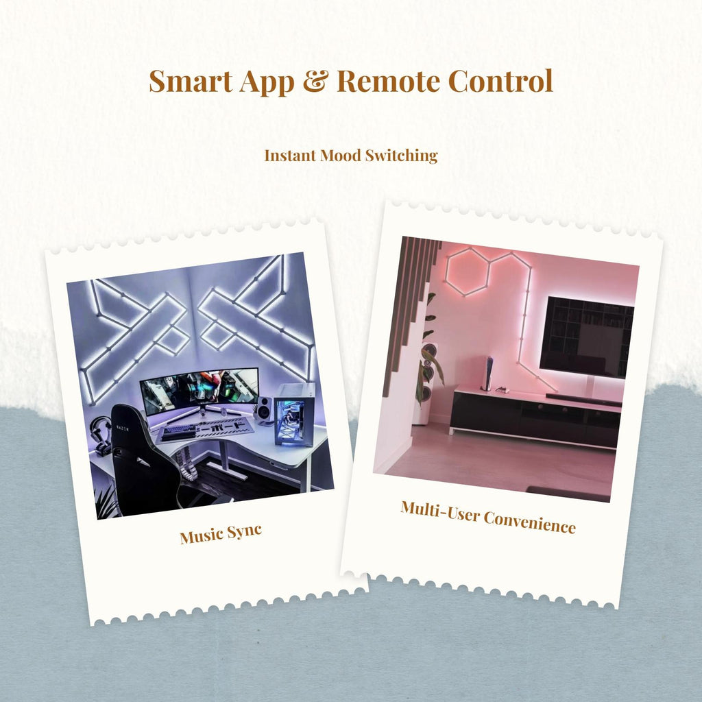 【Smart RGB Gaming Lights for Bedroom】Enhance your gaming room or bedroom with these RGB smart light-emitting diode strip lights, offering customizable atmospheric lighting and lively color-changing effects for a modern atmosphere.【Adaptable Home Decor Lighting】Perfect for living rooms, kids' rooms, studies, and parties, these light-emitting diode wall lights create an energetic mood with adjustable brightness and multiple lighting modes.【Easy Installation & DIY Design】Interchangeable panels and mounting allow for flexible installation and creative DIY arrangements, making it easy to personalize your space.【Smart Control】Enjoy convenient smart control via remote or app, with features like timer, music sync, and easy customization.【sturdy Practical】Made from sturdy PC material, these light-emitting diode lights offer practicality, energy effectiveness, and long performance for commonplace use.