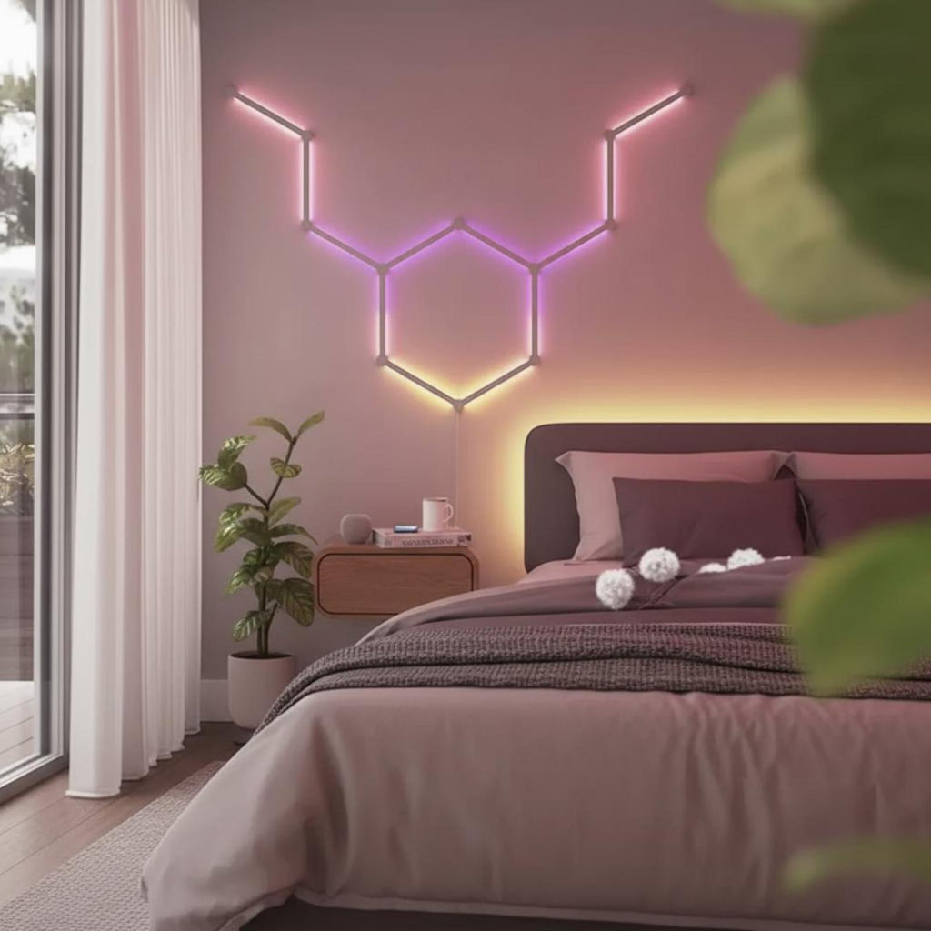 【Smart RGB Gaming Lights for Bedroom】Enhance your gaming room or bedroom with these RGB smart light-emitting diode strip lights, offering customizable atmospheric lighting and lively color-changing effects for a modern atmosphere.【Adaptable Home Decor Lighting】Perfect for living rooms, kids' rooms, studies, and parties, these light-emitting diode wall lights create an energetic mood with adjustable brightness and multiple lighting modes.【Easy Installation & DIY Design】Interchangeable panels and mounting allow for flexible installation and creative DIY arrangements, making it easy to personalize your space.【Smart Control】Enjoy convenient smart control via remote or app, with features like timer, music sync, and easy customization.【sturdy Practical】Made from sturdy PC material, these light-emitting diode lights offer practicality, energy effectiveness, and long performance for commonplace use.Specification: