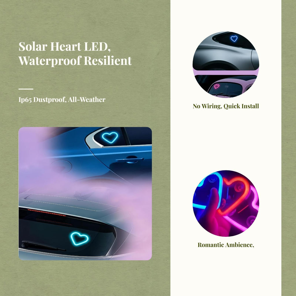[Solar Heart light-emitting diode Car Mood Light] This luminous heart-shaped light is designed for car interior decoration, creating a romantic and lively atmosphere for night drives, family trips on the highway, and common commutes. [Easy Installation] No wiring needed—just attach it to triangular or glass surfaces with suction cups. The solar-powered design powers up automatically during the day and illuminates at night. [Multiple Lighting Modes & Waterproof] Features 4 adjustable lighting modes, IP65 waterproof, and high-brightness light-emitting diodes, making it suitable for use on rainy, snowy, or foggy days. [Universal Fit & Practical Gift] Compatible with various car vehicle, this mood light makes a thoughtful gift for partners, friends, and family, perfect for events like Valentine's Day or Christmas. [resilient Material] Made from acrylic, this car accessory is energy-saving and sturdy, adding a distinctive accent to your vehicle's interior.Specification: