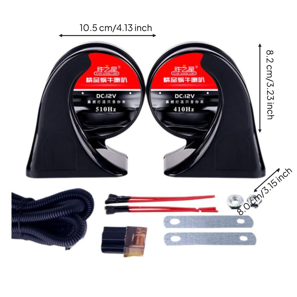 【Super booming Waterproof coiled Horn for Vehicles】This 12V car horn produces a powerful, clear, and attention-grabbing sound, helping to ensure security on both urban and rural roads. The waterproof design ensures dependable performance in all weather conditions.【Universal Fit and Easy Installation】Suitable for cars, motorcycles, vehicles, and any 12V vehicle, this coiled horn features simple installation and a sturdy mounting system for effortless setup.【sturdy Double Tone Construction】Crafted from high-quality metal and aluminum alloy, the double-tone horn provides a longresilient finish and optimal sound projection, making it a practical automotive accessory.【Enhanced Safety Feature】Delivers clear alerts to warn vehicles and pedestrians, draw attention, and improve driving safety in any environment.【Optimized Practical Design】small size, low power consumption, and direct replacement capability make this horn a cost-effective enhancement for your vehicle.Specification: