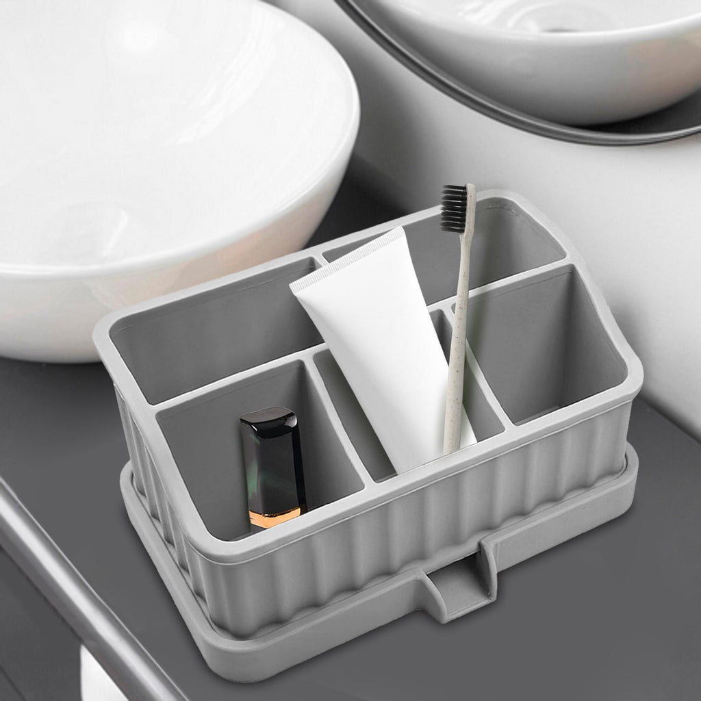 【Silicone Material】: Made from quality silicone, thisBathroom Counter Organizer is long term and resistant to deformation or breakage even if accidentally dropped. Its non slip grid design at the base keeps from sliding, making it stable for use