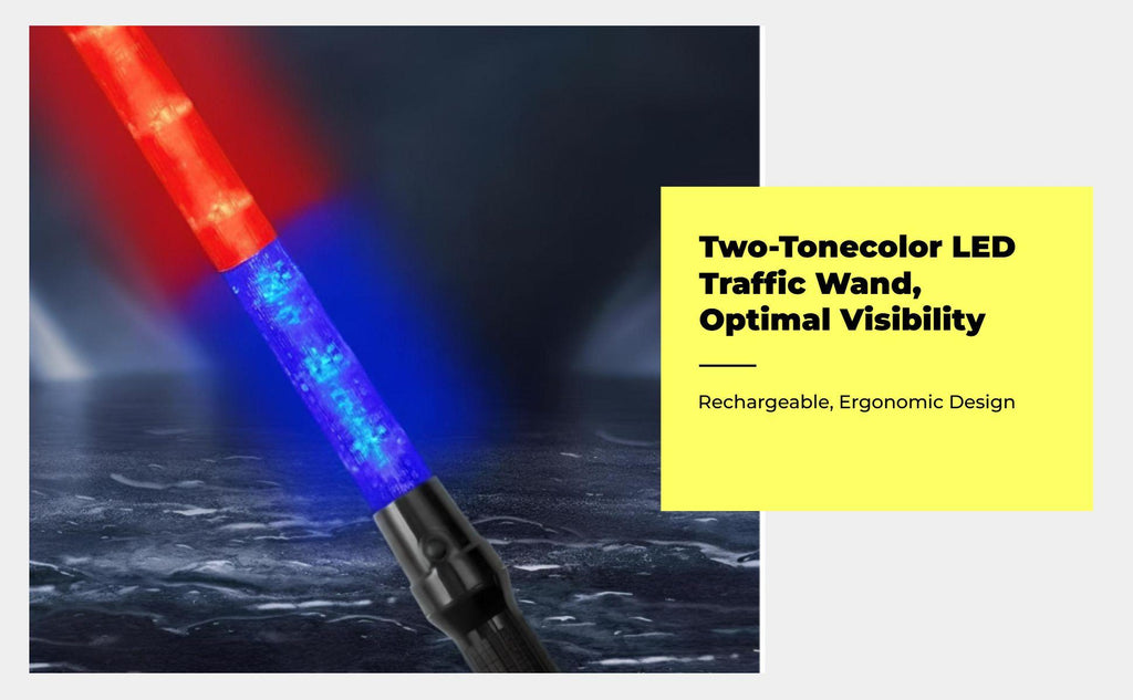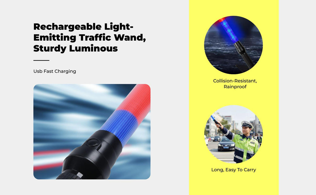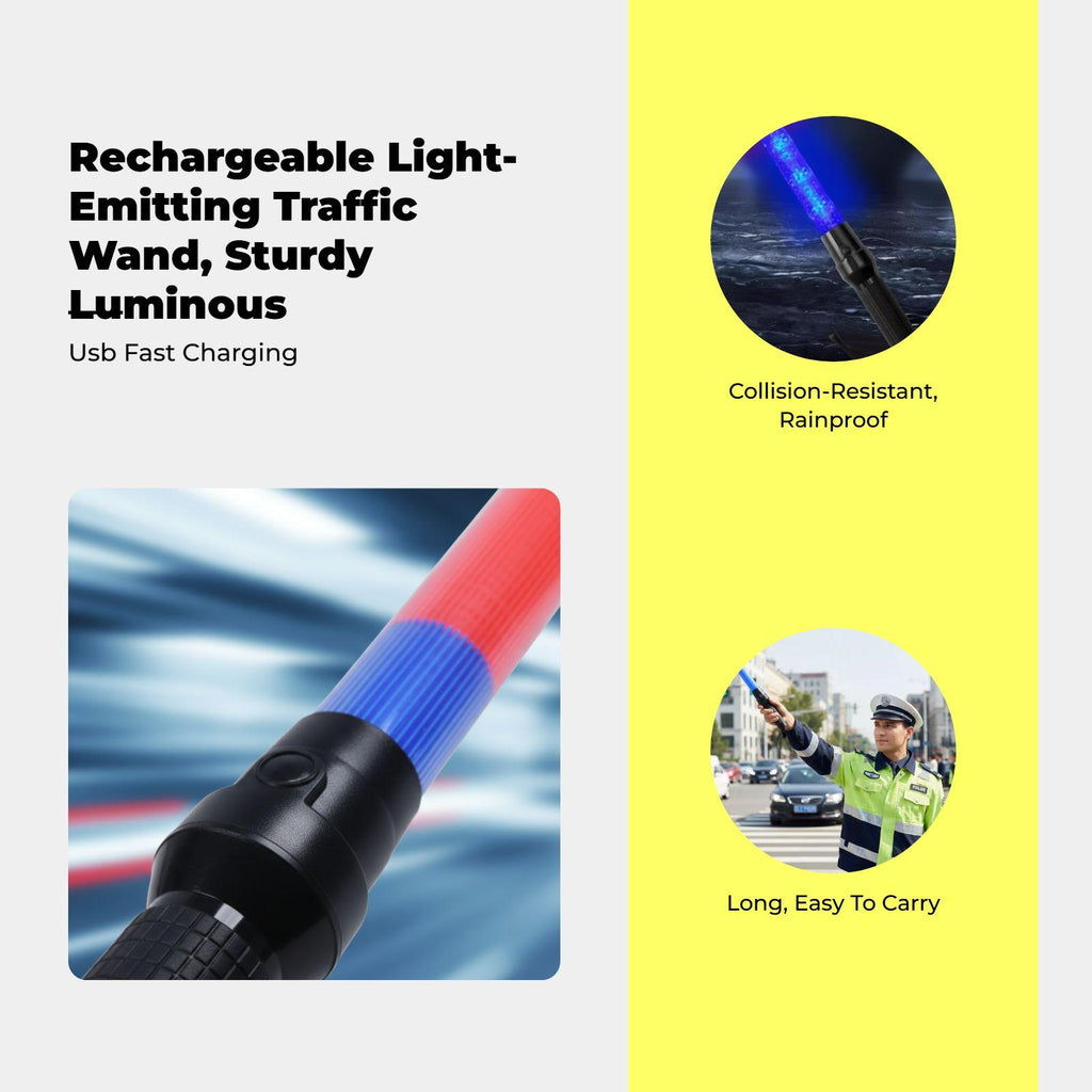 [Adaptable Traffic Control] This wand combines traffic control, emergency signaling, and parking guidance functionalities, making it perfect for highway operations, construction sites, and security tasks. [Rechargeable and Energy Efficient] Featuring a rechargeable battery, this traffic wand provides long lighting and is convenient for repeated use across various scenarios. [Multiple Flashing Modes] Offers 3 flashing modes with red and lavender lights, improving visibility and ensuring effective signaling in low-light or emergency situations. [sturdy and Rainproof Design] Built with resistantresistant and rainproof materials, this light-emitting wand is suitable for outdoor use, including air marshalling, parking guidance, and roadside emergencies. [Easy to Use and Portable] The handheld design comes with a wrist strap and hanging rope for easy carrying, making it perfect for security personnel, parking attendants, and emergency responders.Specification: