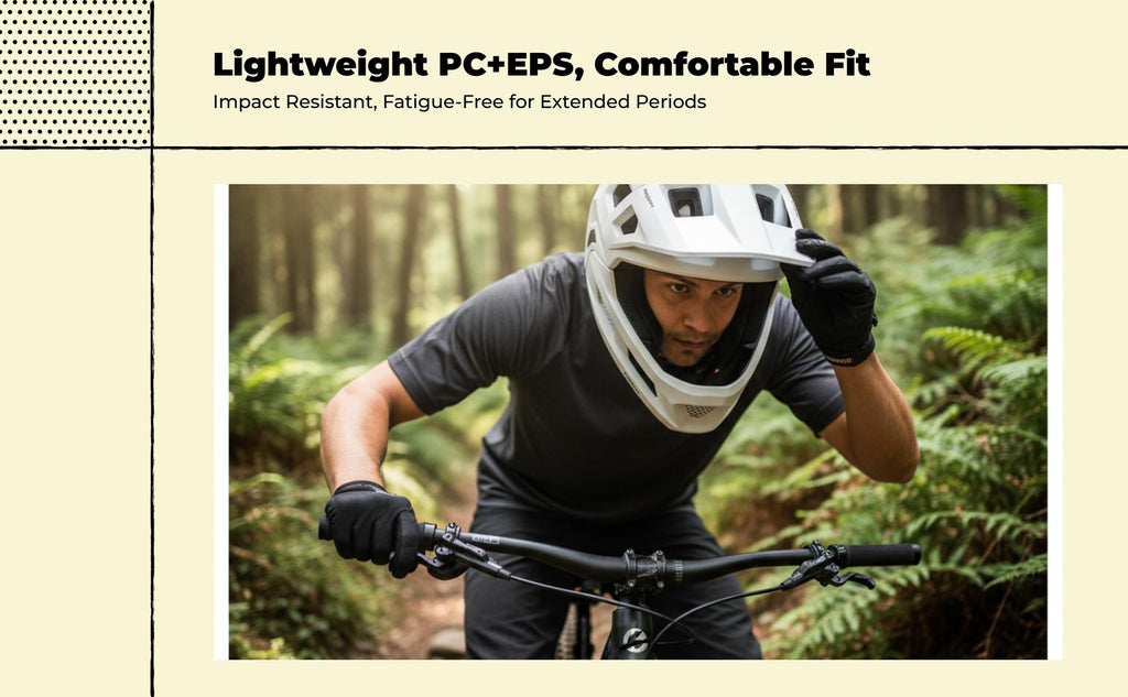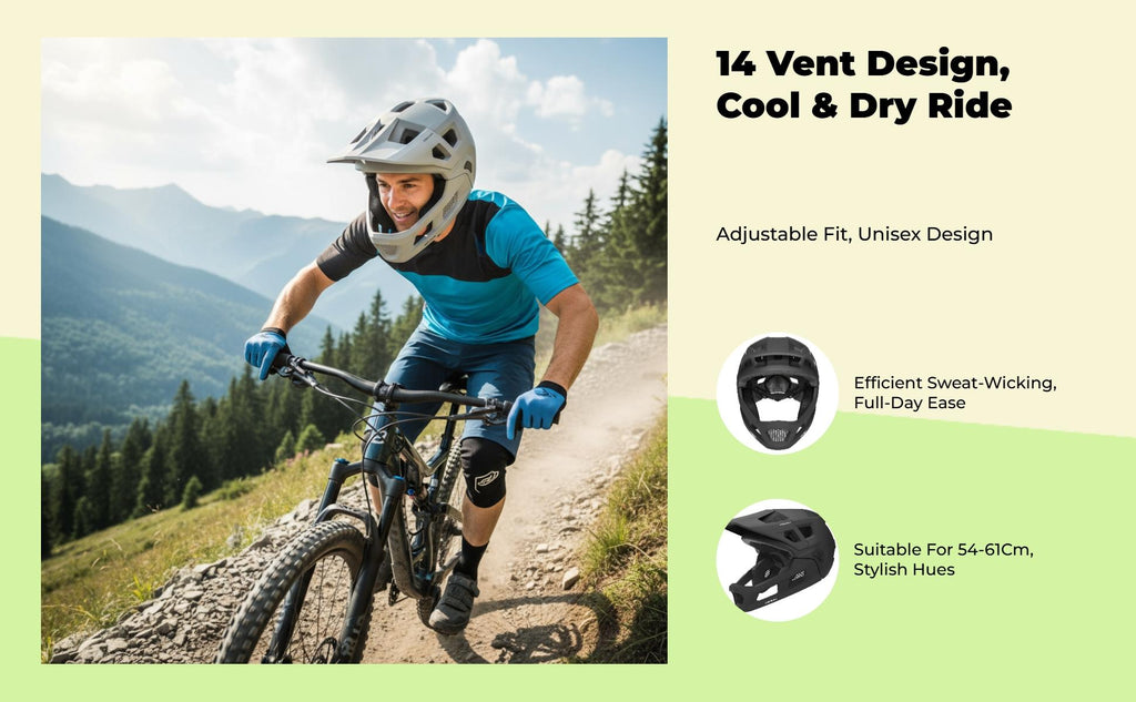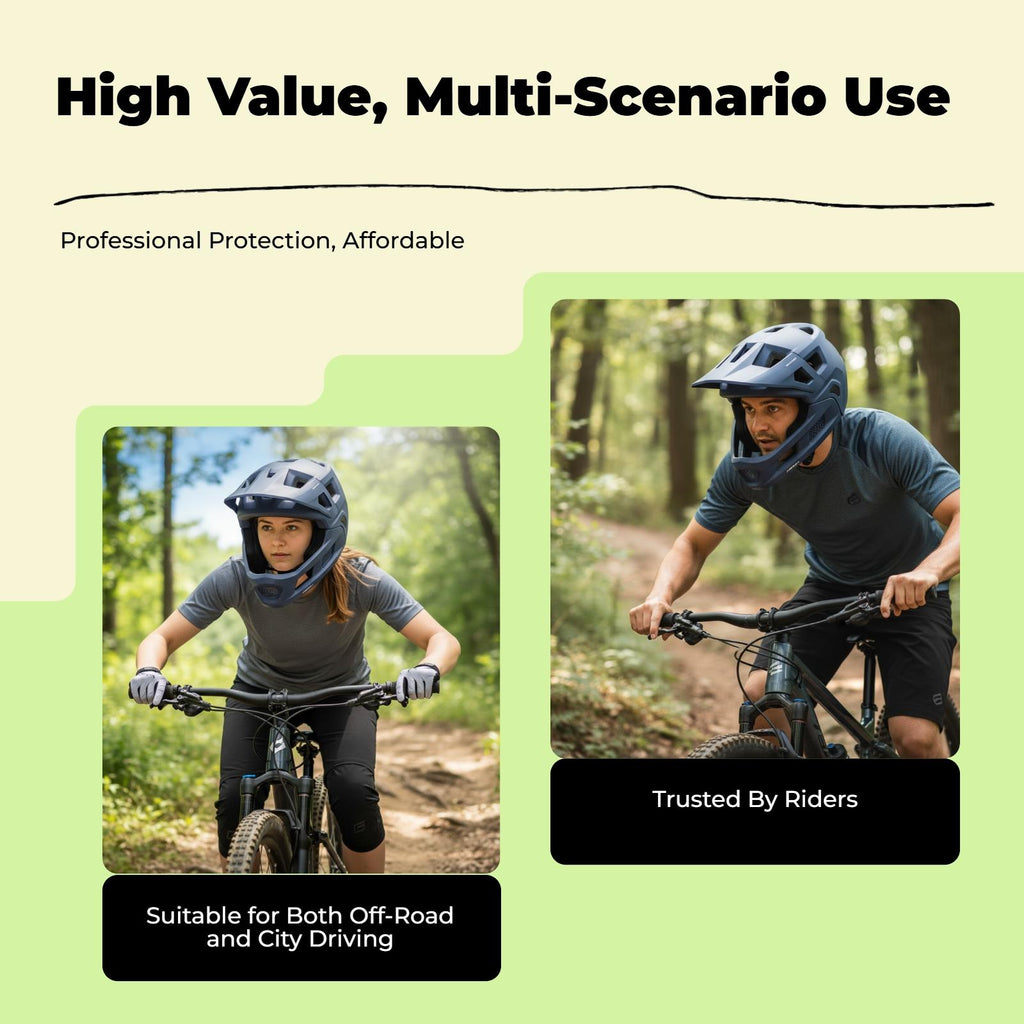 【Lightweight Trail Helmet for Adults】This cycling helmet features a detachable chin guard and lightweight design, offering adaptable protection for trail riding, cycling, and urban commuting. 【Adjustable and Comfortable Fit】Equipped with an adjustable strap and universal size (54–61 cm), ensuring a secure and comfortable fit for both men and women during long rides. 【High-Quality Foam+PC Material】Constructed from sturdy foam and PC, this helmet provides dependable collision absorption and enhanced for various cycling situations. 【Ventilation and Protection】Designed with multiple air vents for breathability, it also protects you from sunlight and debris while cycling outdoors. 【Practical and Cost-Effective Option】perfect for trail biking, urban cycling, and commuting, this helmet offers practicality and value.