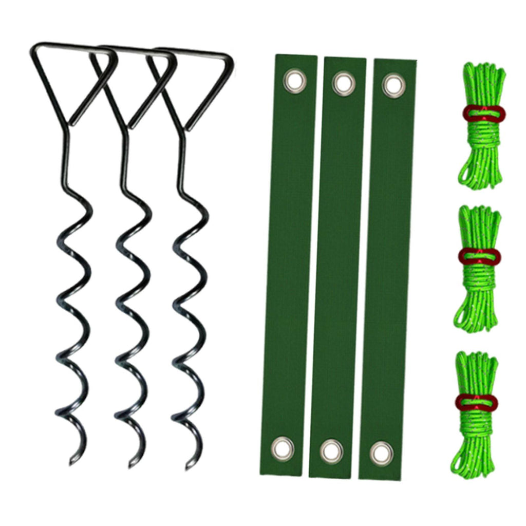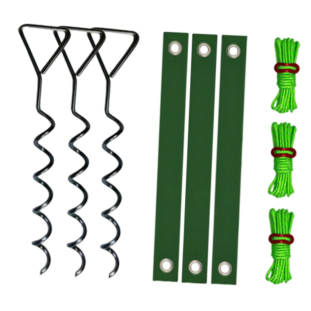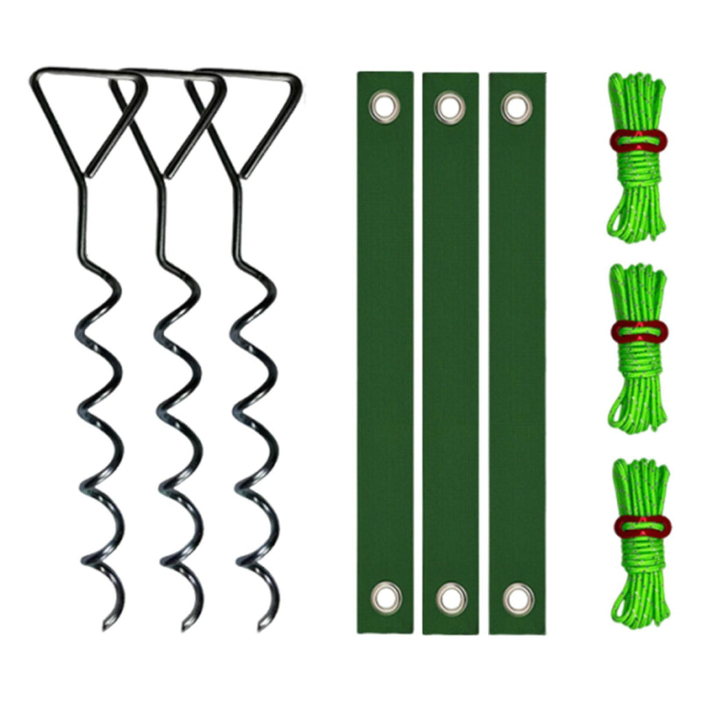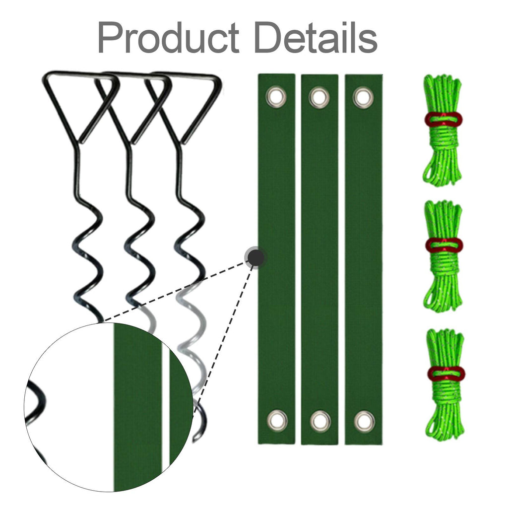 【Comprehensive Set】: The package includes a complete 9-piece set, featuring spiral ground anchors, tree ties, and wind ropes to provide a reliable anchoring solution for various applications