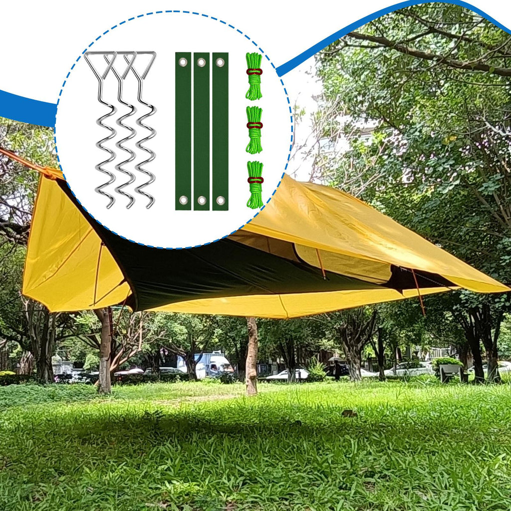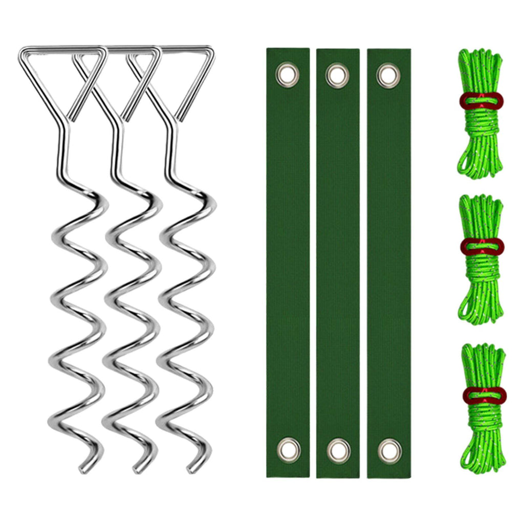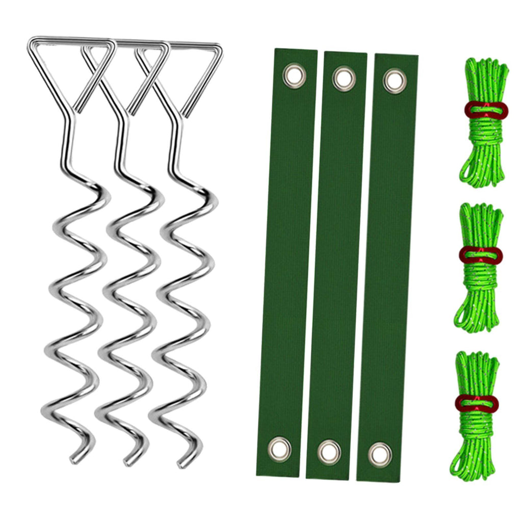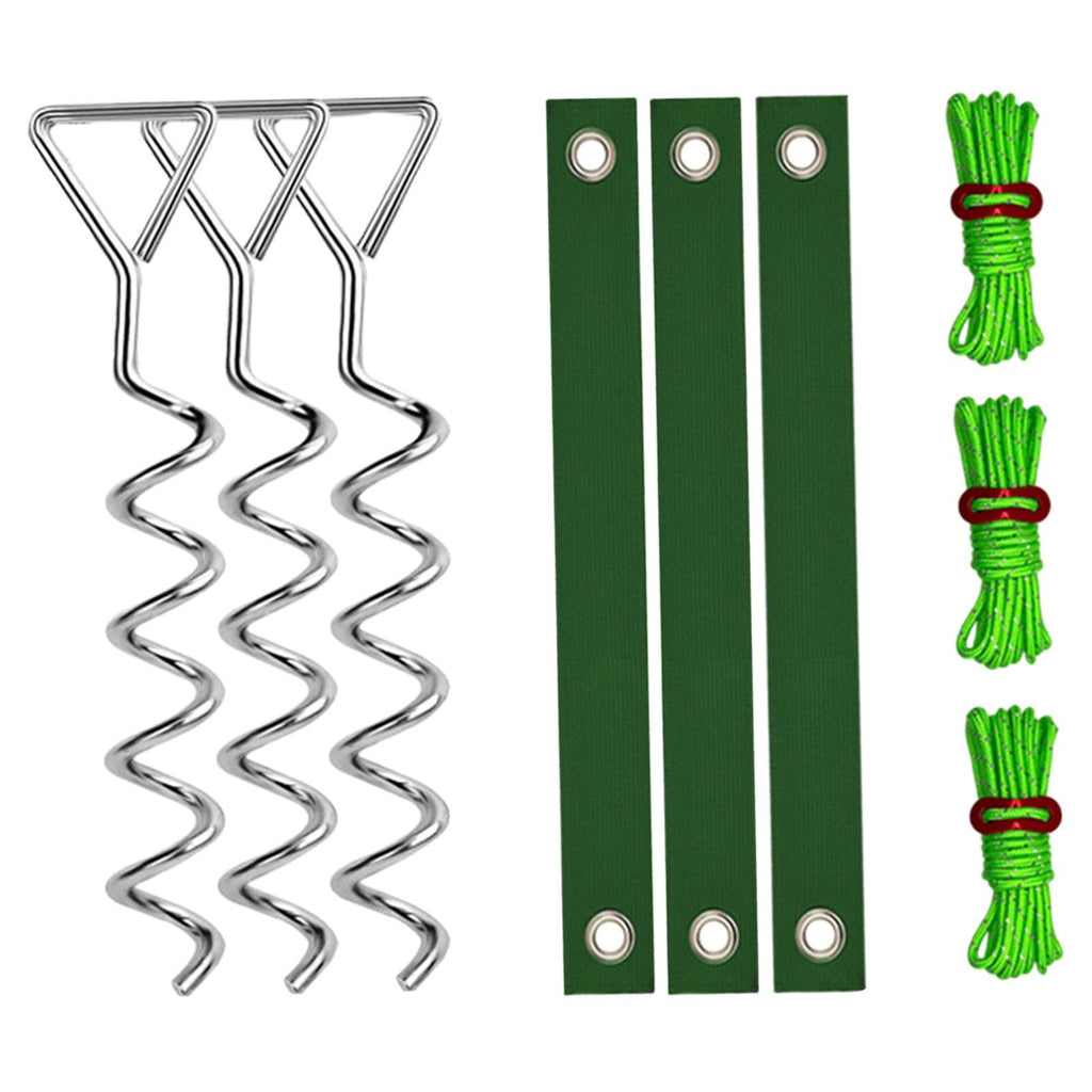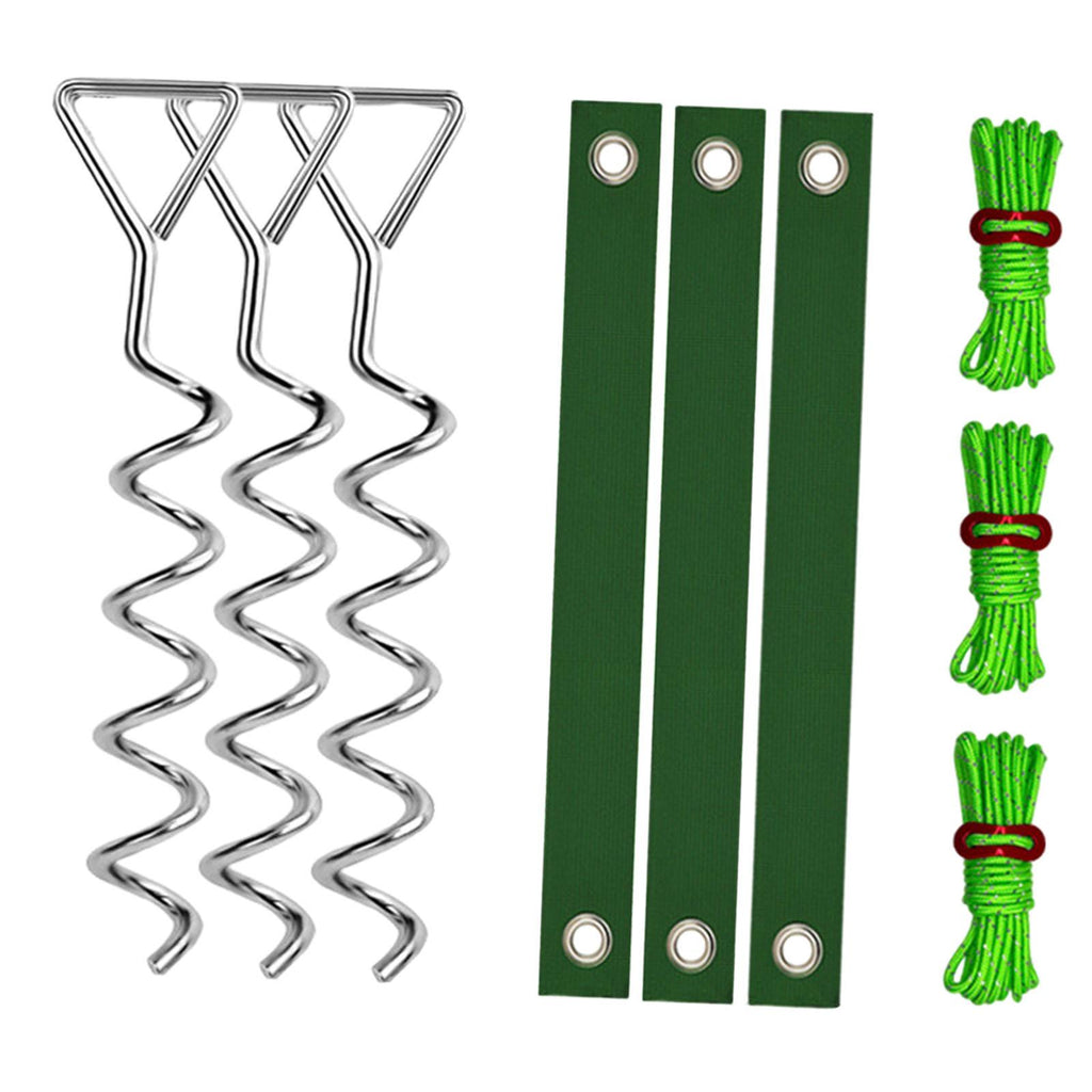 【Comprehensive Set】: The package includes a complete 9-piece set, featuring spiral ground anchors, tree ties, and wind ropes to provide a reliable anchoring solution for various applications