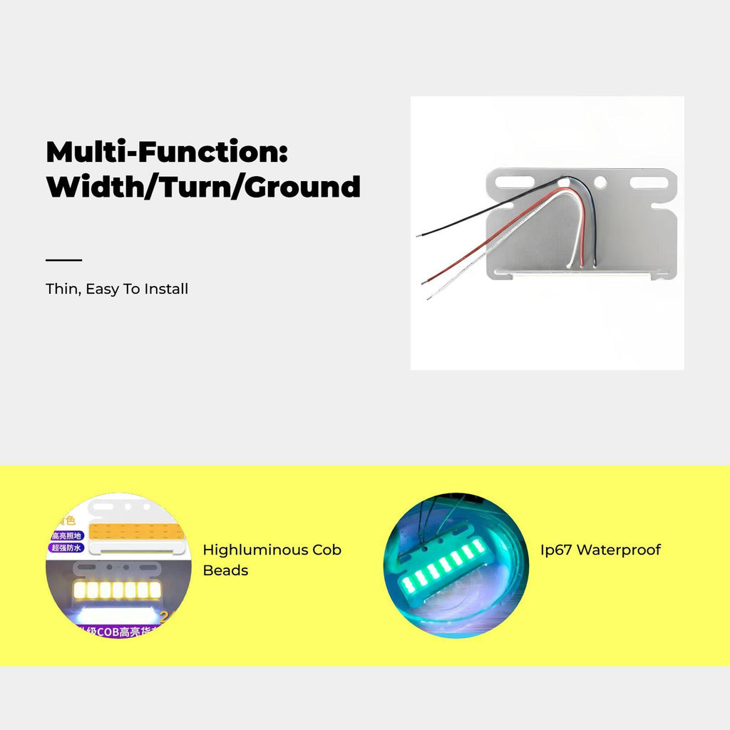 [High-Quality Vehicle Side Marker Light] This light-emitting diode side marker light uses COB technology for extremely bright lighting, ensuring enhanced visibility for vehicles, trailers, pickups, and SUVs in a variety of driving situations. [Waterproof and sturdy Design] With an IP67 waterproof and robust construction, this side marker light is perfect for outdoor use, resisting particles, vibration, and scratches for long performance. [ and Practical Design] The shape allows for easy installation on running boards, vehicle sides, or panels, providing courtesy lighting and sequential turn alert functionality. [Versatile Application] Perfect for larger vehicles, trailers, pickups, RVs, and boats, this light-emitting diode side marker light improves both appearance and lighting for extended cab vehicles. [Flexible and Energy Efficient] COB light-emitting diode technology delivers powerful lighting with low energy consumption, making it a cost-effective solution for upgrading vehicle lighting.