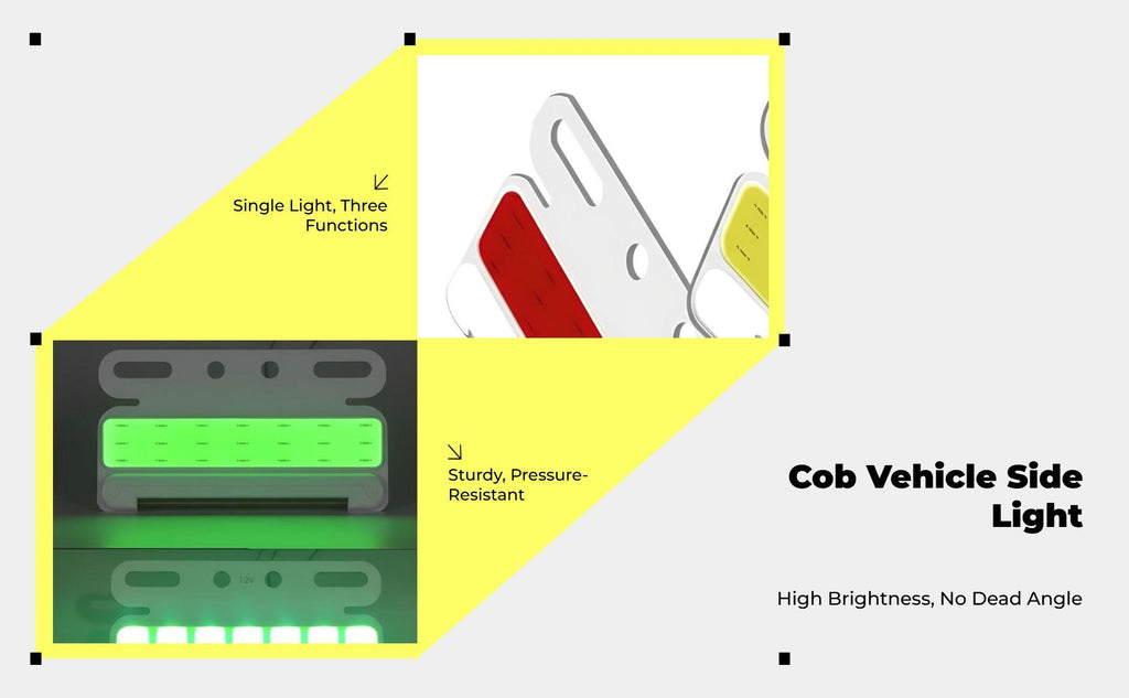 [High-Quality Vehicle Side Marker Light] This light-emitting diode side marker light uses COB technology for extremely bright lighting, ensuring enhanced visibility for vehicles, trailers, pickups, and SUVs in a variety of driving situations. [Waterproof and sturdy Design] With an IP67 waterproof and robust construction, this side marker light is perfect for outdoor use, resisting particles, vibration, and scratches for long performance. [ and Practical Design] The shape allows for easy installation on running boards, vehicle sides, or panels, providing courtesy lighting and sequential turn alert functionality. [Versatile Application] Perfect for larger vehicles, trailers, pickups, RVs, and boats, this light-emitting diode side marker light improves both appearance and lighting for extended cab vehicles. [Flexible and Energy Efficient] COB light-emitting diode technology delivers powerful lighting with low energy consumption, making it a cost-effective solution for upgrading vehicle lighting.Specification: