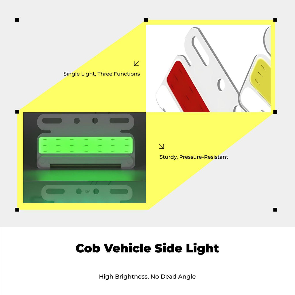[High-Quality Vehicle Side Marker Light] This light-emitting diode side marker light uses COB technology for extremely bright lighting, ensuring enhanced visibility for vehicles, trailers, pickups, and SUVs in a variety of driving situations. [Waterproof and sturdy Design] With an IP67 waterproof and robust construction, this side marker light is perfect for outdoor use, resisting particles, vibration, and scratches for long performance. [ and Practical Design] The shape allows for easy installation on running boards, vehicle sides, or panels, providing courtesy lighting and sequential turn alert functionality. [Versatile Application] Perfect for larger vehicles, trailers, pickups, RVs, and boats, this light-emitting diode side marker light improves both appearance and lighting for extended cab vehicles. [Flexible and Energy Efficient] COB light-emitting diode technology delivers powerful lighting with low energy consumption, making it a cost-effective solution for upgrading vehicle lighting.Specification: