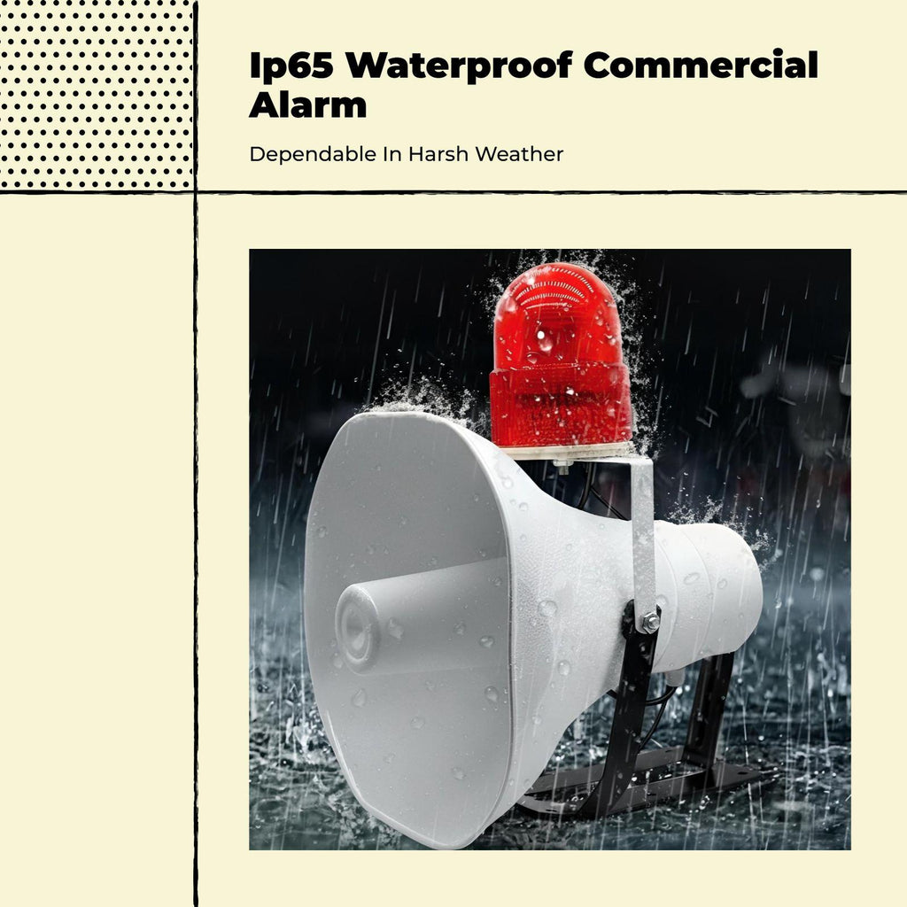 【Waterproof Commercial Alarm for Safety】This high-powered horn provides powerful sound and flashing light alerts, making it perfect for emergency warnings in factories, warehouses, and outdoor areas.【High Decibel & Adjustable Volume】Offers up to 120db with adjustable volume, ensuring clear alerts in noisy environments and large spaces.【sturdy Waterproof Construction】IP65-rated waterproof design resists tough outdoor conditions, suitable for outdoor work, assistance, and commercial locations.【Versatile Installation & Application】Easy hanging installation, compatible with AC110V/220V, perfect for hoisting equipment, cranes, and public spaces.【dependable Performance for Various Scenarios】Practical and economical, this alarm is suitable for schools, buildings, workplaces, and rural settings.Specification: