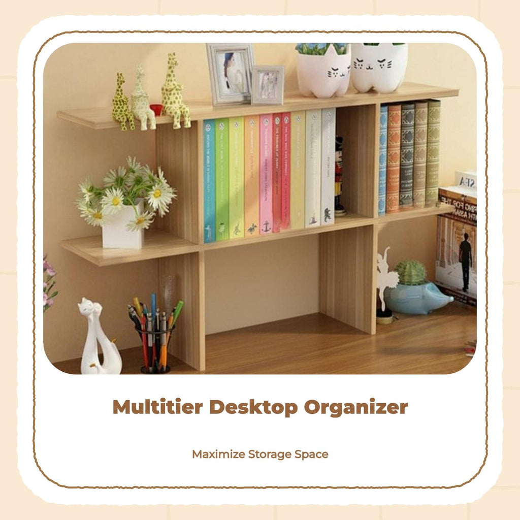 [Efficient Desktop Organization Solution] The wooden desktop organizer with a multitier storage rack design helps keep your workspace tidy and organized, making it perfect for storing small items and displaying stationery. [Strong and Sturdy Construction] Made from wood and reinforced board, this organizer shelf provides dependable support for books, notepads, pens, and office supplies. [Space-Efficient and Space-Saving] perfect for office, dorm, school, or home use, its space-saving design maximizes your desktop space while offering generous storage capacity. [Adaptable Display and Storage] Suitable as a book display, display rack, or cabinet organizer shelf, it accommodates various desktop settings and styles. [Practical and Stylish Addition] With its functional storage and elegant wood finish, this organizer boosts both the utility and decor of your workspace.Specification: