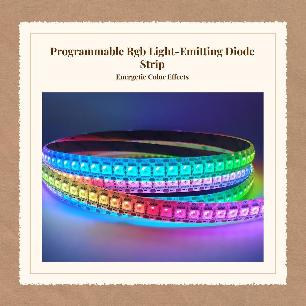 【Programmable RGB Lighting Strip for Bedroom Decor】This WS2812B lighting strip features individually addressable 5050 RGB light-emitting diode chips, providing luminous, color-changing effects and flexible installation for bedrooms, living rooms, and gaming setups.【Waterproof and resilient Design】The silicone-coated strip is IP67 waterproof, perfect for indoor use in kitchens, cabinets, mirrors, and shelves, ensuring dependable long-term performance.【Smart Control and Customization】Supports app control, music sync, voice control, and timer settings, allowing you to personalize lighting scenes for parties, home décor, and DIY projects.【Easy Installation and Adjustable Lengths】The upgraded backing and cuttable design make installation simple on desks, TVs, and car chassis, adapting to different spaces and creative needs.【Versatile Applications】Enjoy vivid, full-color lighting to enhance the atmosphere in hotels, lounges, shops, and gaming rooms, with dependable performance and strong practicality.Specification: