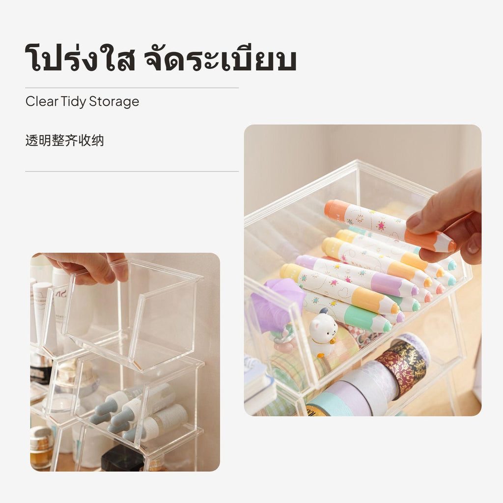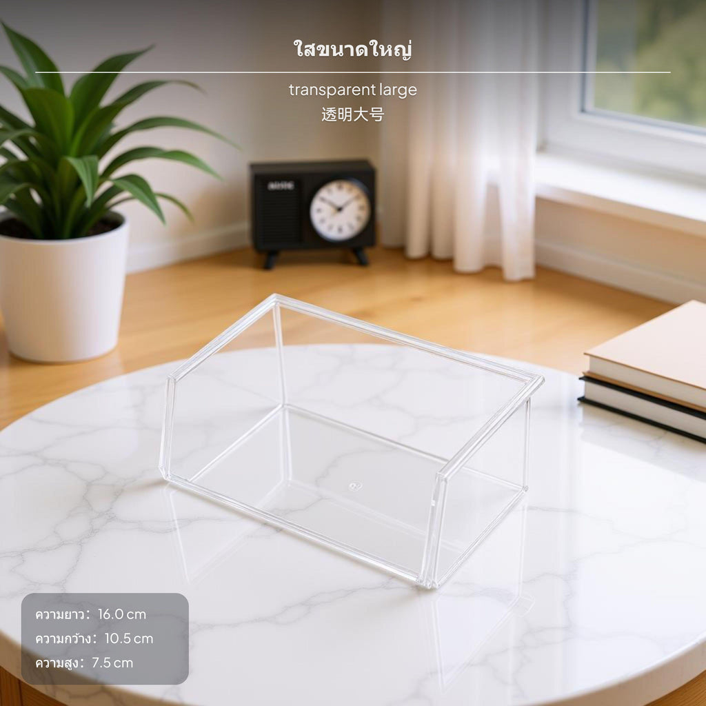 [Clear Visibility & Efficient Organization] 2-piece transparent makeup organizer set brings transparency and sophistication to your desktop. The see-through design allows easy identification of cosmetics, lipsticks, stationery and assorted items, ensuring everything is neatly stored.[Stackable & Space-Saving Solution] Organized storage is simplified with the stackable function and matching height design, maximizing your upright desktop space in vanity corners, offices, bedrooms, or dorm rooms.[multipurpose Use for Multiple Scenarios] Use as a cosmetic display box, pen holder, or open storage solution for skincare, accessories, and small essentials—perfect for dressing tables, desks, or as a space-saving home organizer.[clean contemporary Acrylic design] The transparent plastic (PS) construction offers a sleek, minimalist look that blends seamlessly with any décor while providing stable support for single or stacked use.[Flexible Size Combination] Includes a single large box (16cm x 10.5cm x 7.5cm) and a single small box (10cm x 8.5cm x 7.5cm), meeting diverse storage requirements. Easily combine and rearrange based on your needs to keep your environment tidy.Specification: