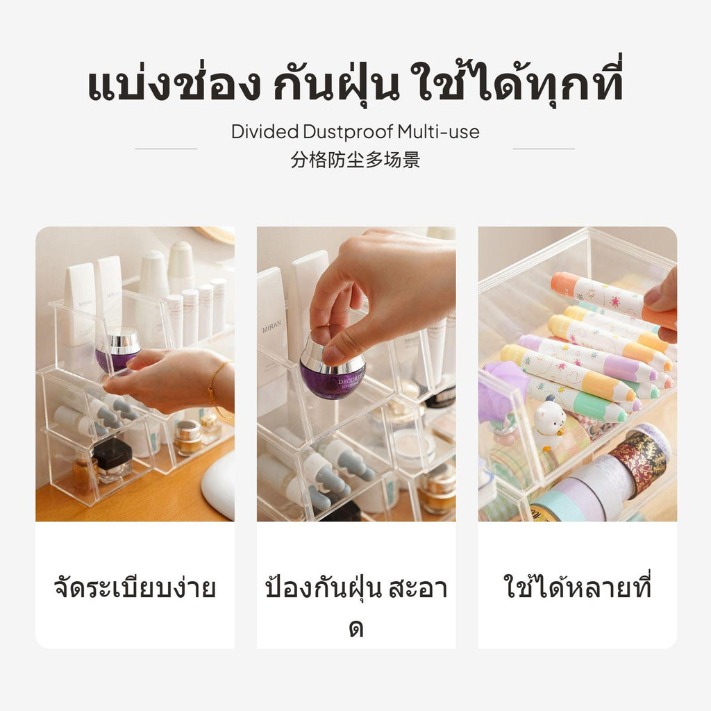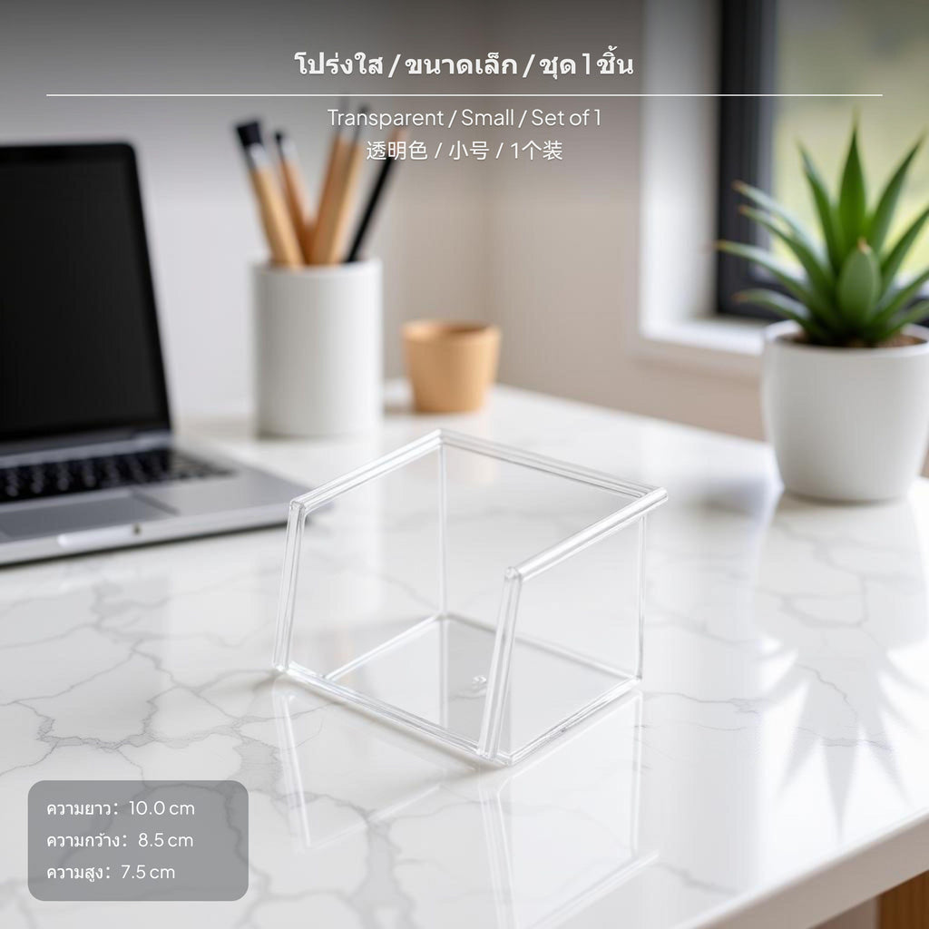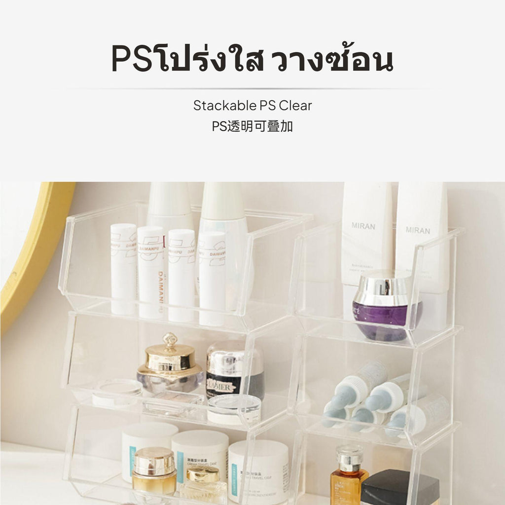 [Clear Visibility & Efficient Organization] 2-piece transparent makeup organizer set brings transparency and sophistication to your desktop. The see-through design allows easy identification of cosmetics, lipsticks, stationery and assorted items, ensuring everything is neatly stored.[Stackable & Space-Saving Solution] Organized storage is simplified with the stackable function and matching height design, maximizing your upright desktop space in vanity corners, offices, bedrooms, or dorm rooms.[multipurpose Use for Multiple Scenarios] Use as a cosmetic display box, pen holder, or open storage solution for skincare, accessories, and small essentials—perfect for dressing tables, desks, or as a space-saving home organizer.[clean contemporary Acrylic design] The transparent plastic (PS) construction offers a sleek, minimalist look that blends seamlessly with any décor while providing stable support for single or stacked use.[Flexible Size Combination] Includes a single large box (16cm x 10.5cm x 7.5cm) and a single small box (10cm x 8.5cm x 7.5cm), meeting diverse storage requirements. Easily combine and rearrange based on your needs to keep your environment tidy.Specification: