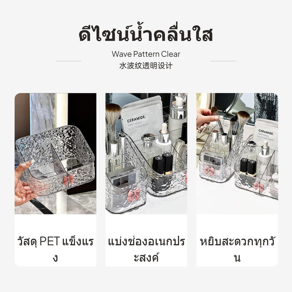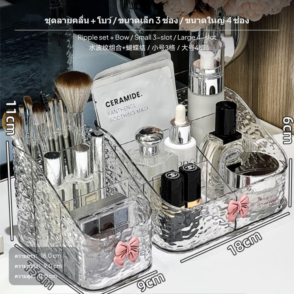 Acrylic Cosmetic Organizer, Desktop Makeup Storage Box, Large Capacity, Clear Ripple Design for Vanity, Lipstick & Skincare Holder Set S3 L4 with Bow