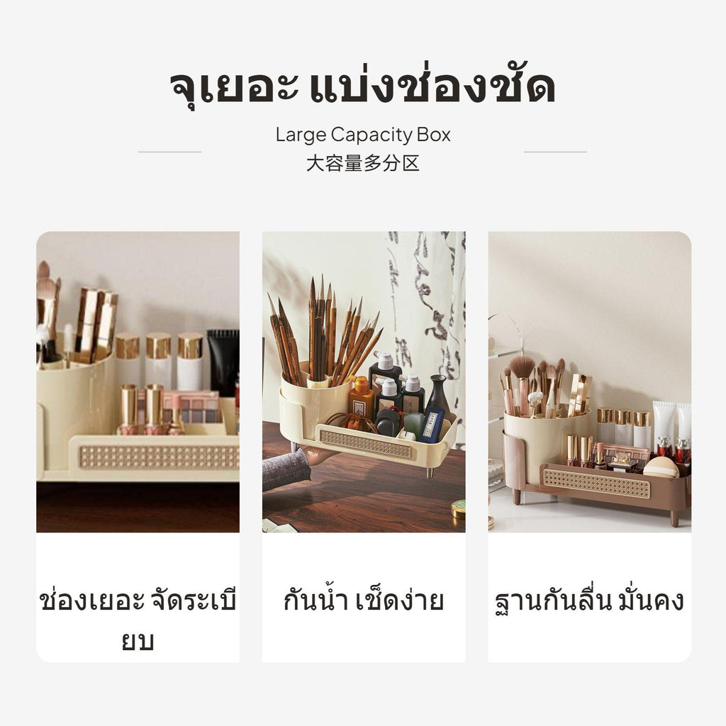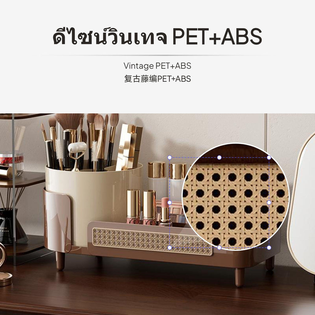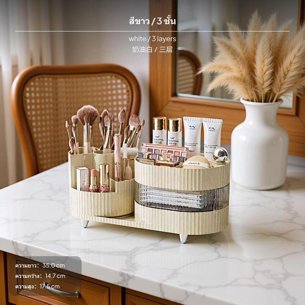 [Efficient Multi-Zone Storage] This makeup organizer box features a thoughtfully divided design and spacious compartments to keep cosmetics, skincare, and brushes easily accessible and well sorted.[Modern Elegant Design] The organizer’s minimalist aesthetic, geometric embellishments, and three timeless color choices enhance any countertop, vanity, or desktop with a refined finish.[Rotating Functionality for Convenience] The innovative 360° rotating brush holder or three-level rotating drawers allow you to reach items quickly from any angle, perfect for busy makeup routines or compact spaces.[Premium PET+ABS Material] Constructed from high-quality PET+ABS, this box is sturdy, easy to clean, and ensures a polished texture that elevates the look and functionality of your cosmetic area.[adaptable for Multiple Settings] perfect for dressing tables, bathroom counters, bedrooms, or office desks, this multi-functional storage holder is designed to organize not just makeup, but also jewelry, stationery, and everyday essentials.Specification: