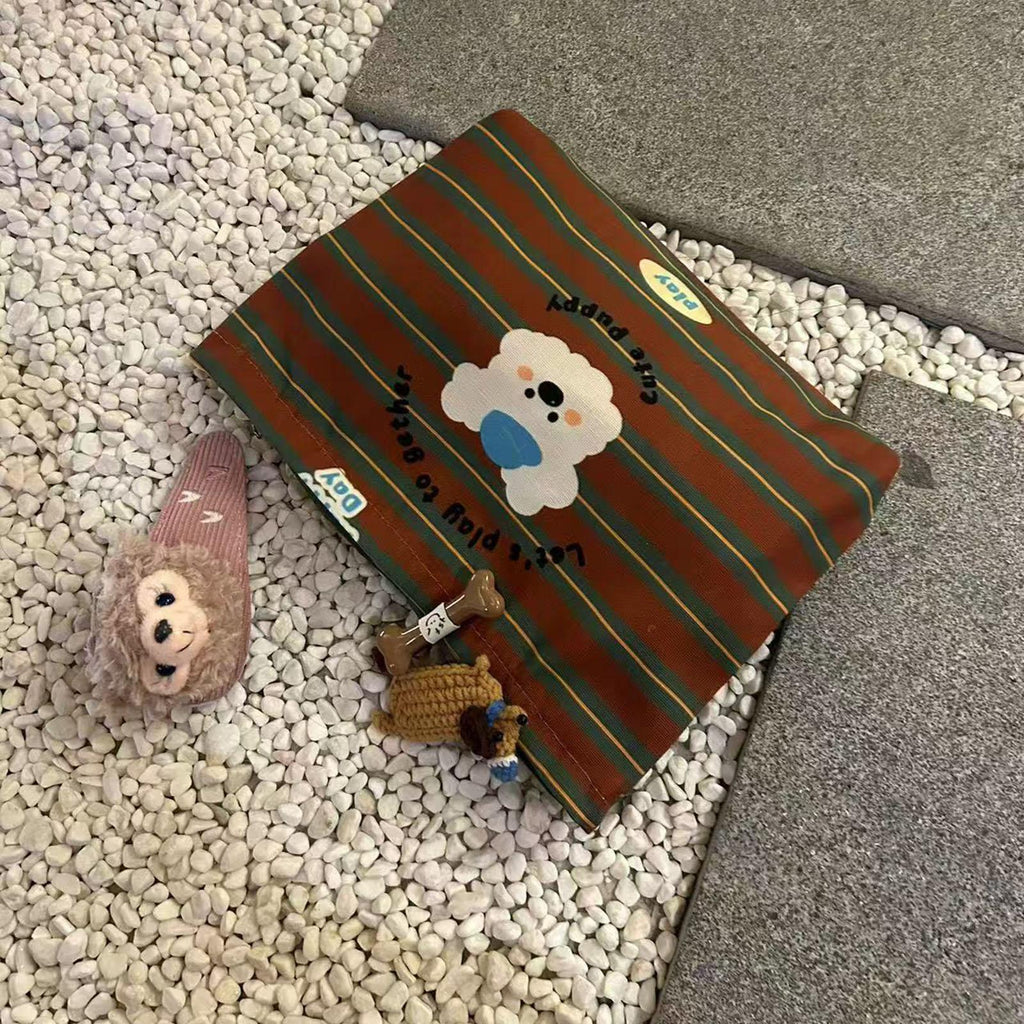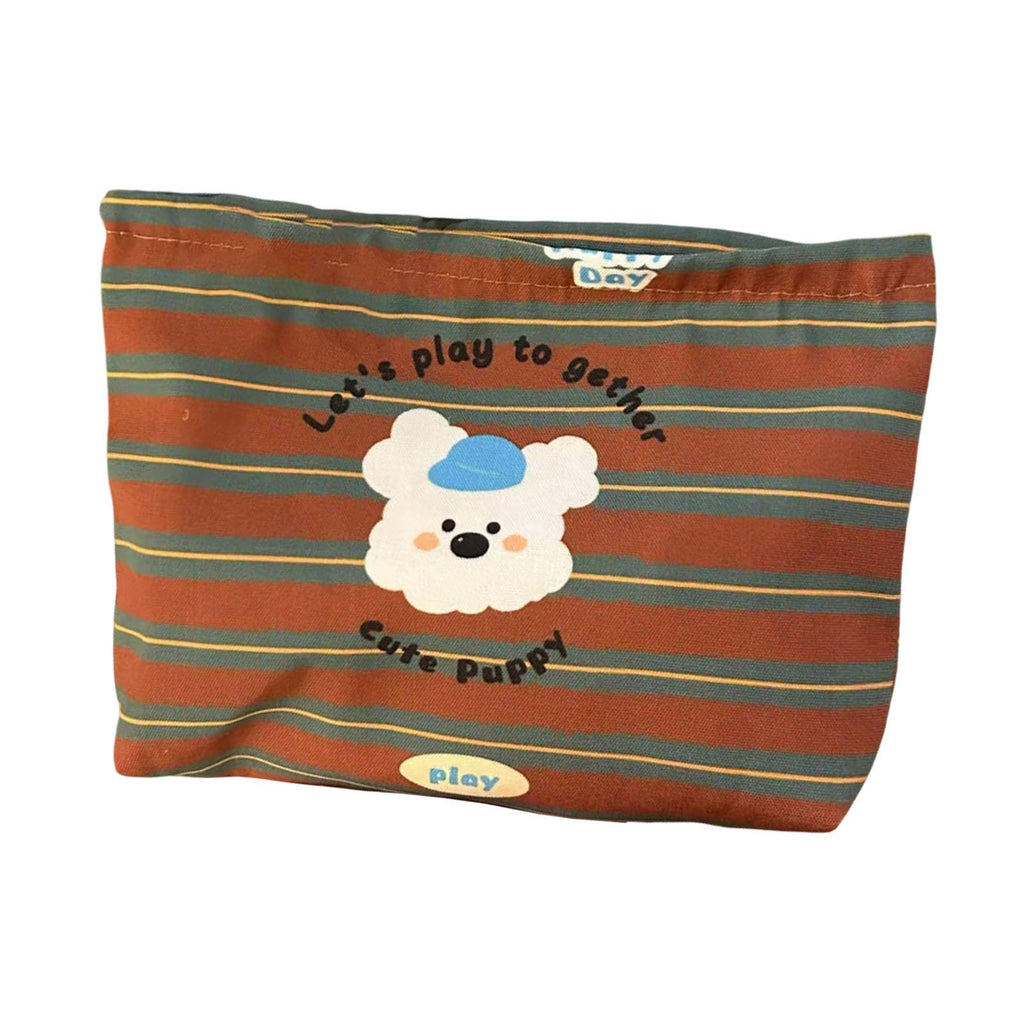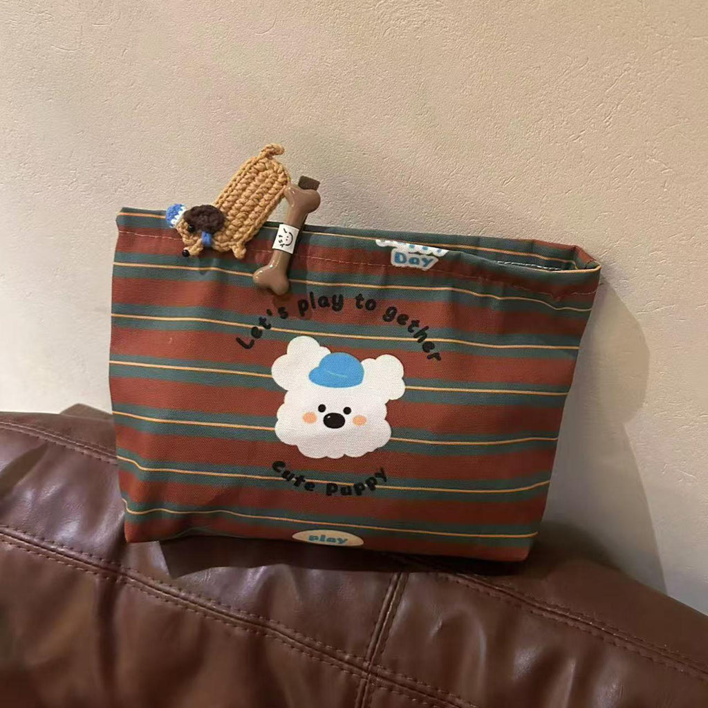 【Stylish Design】: This makeup bag features a trendy striped pattern with an adorable dog motif, making it a fashionable accessory for any occasion