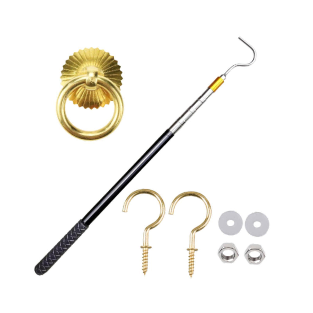 【Easy Use】: Equipped with a telescopic extension pole that extends from 22 to 64.6 inches, this Loft Pull System Hook tool allows for effortless opening or closing of the attic ladder pull down system door. The kit includes brass colored storage hooks and screw for straightforward installation