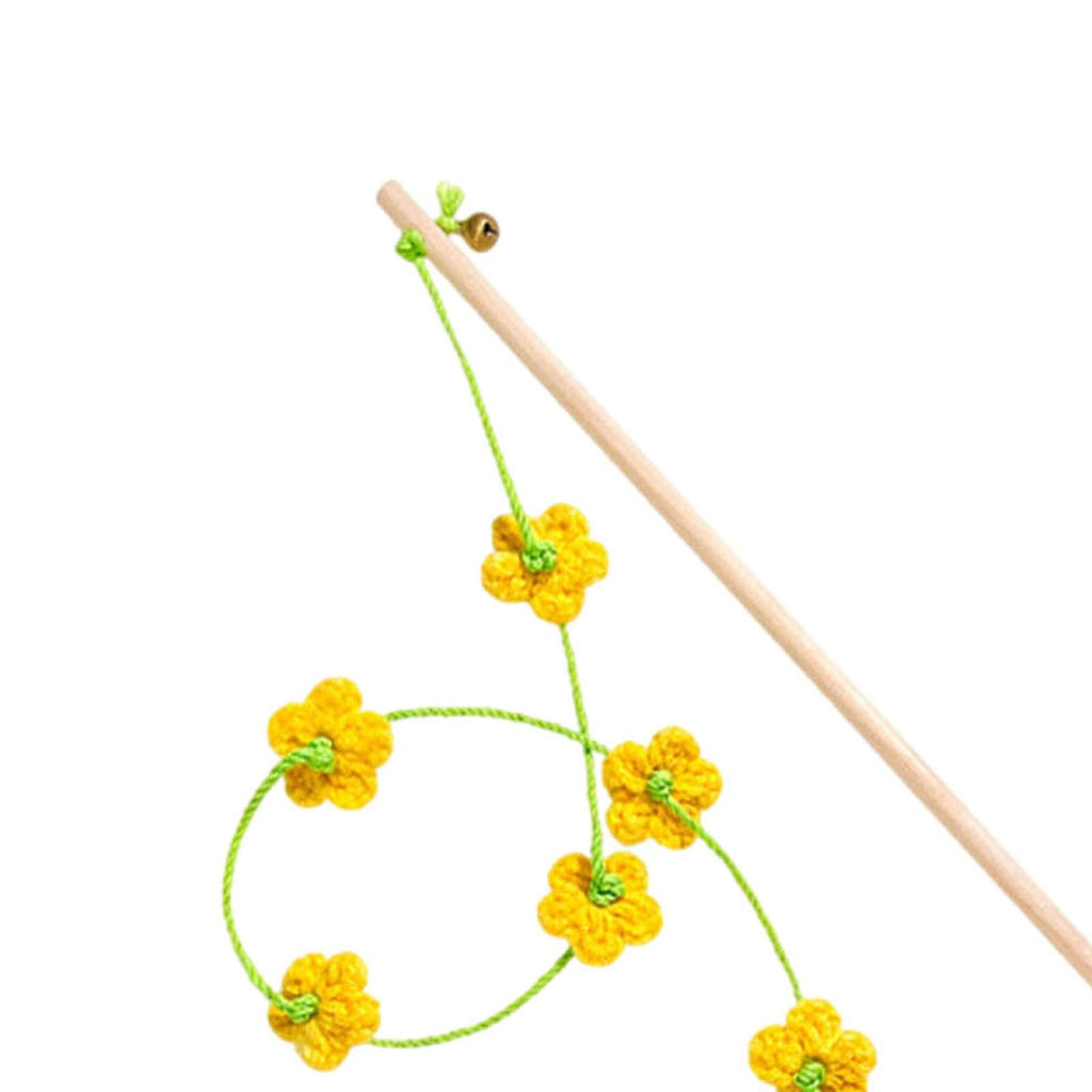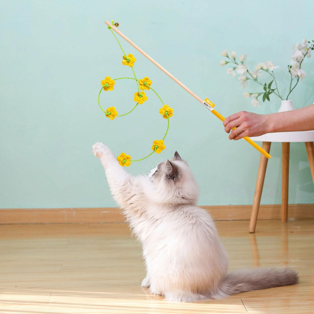【Cute design】: This cat teasing pole features floral embellishments, a comfortable, sturdy handle, and a bell on top, making it fun for your cat to play