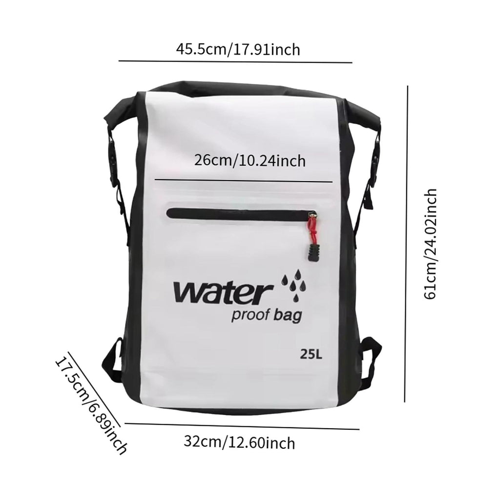 【Size Information】:25L PVC Dry Bag Backpack with large front pocket (flat size) measures approx 32cmx17.5cmx61cm/12.60inchx6.89inchx24.02inch