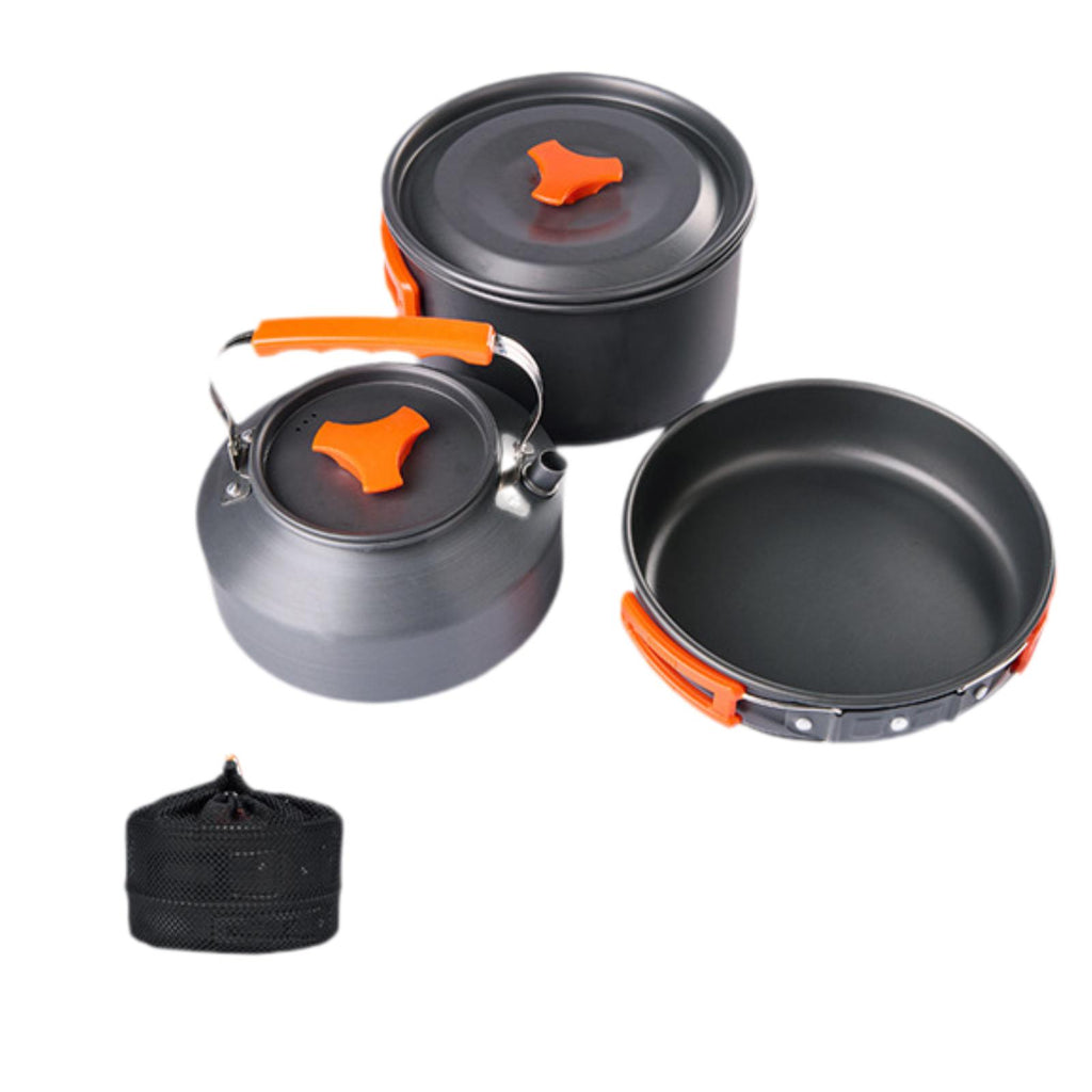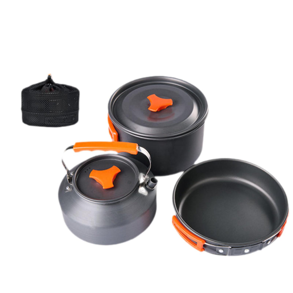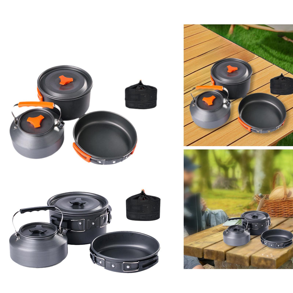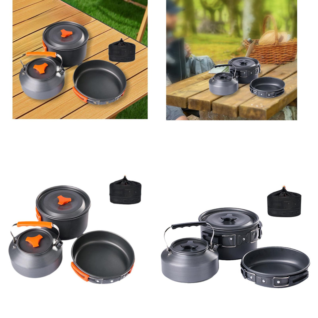 【Camping Cooking Set】: Camping cookware set for 2-3 persons, including 1 pot, 1 frying pan, and 1 kettle, meeting a variety of cooking needs.