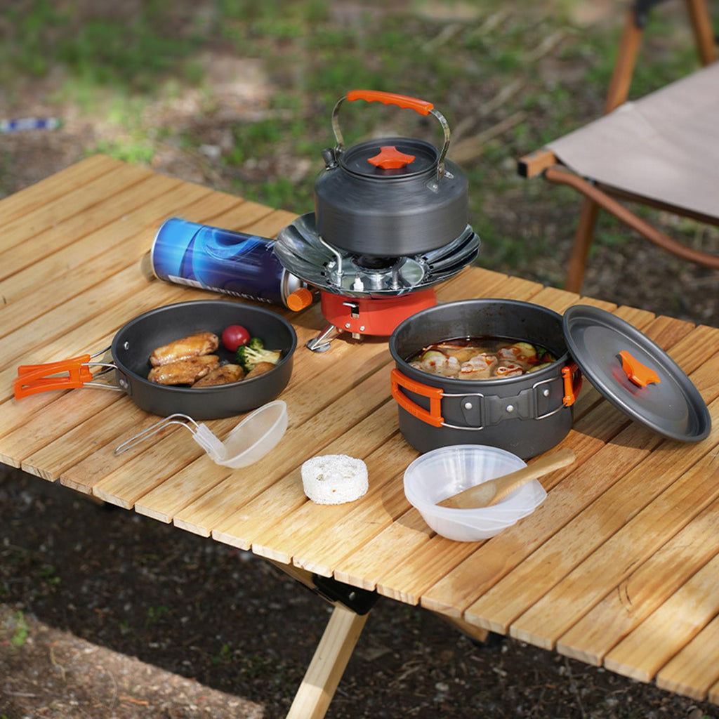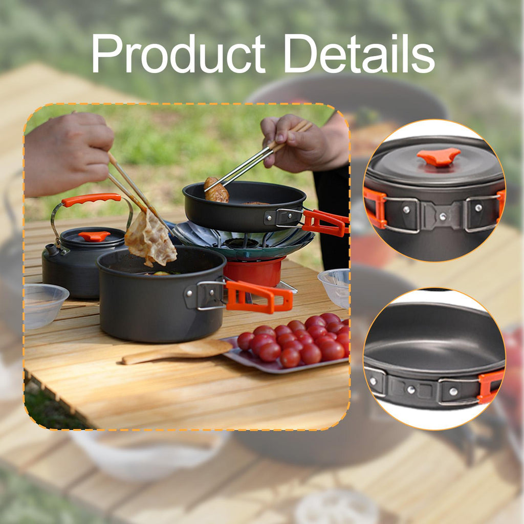 【Premium Material】: The camping cooker set adopts a premium aluminum alloy body and PP handle, good heat conduction, high temperature resistance, wear resistance, and ensures a long time to use