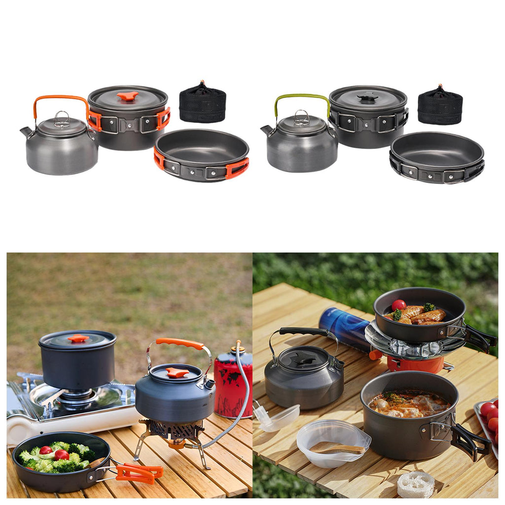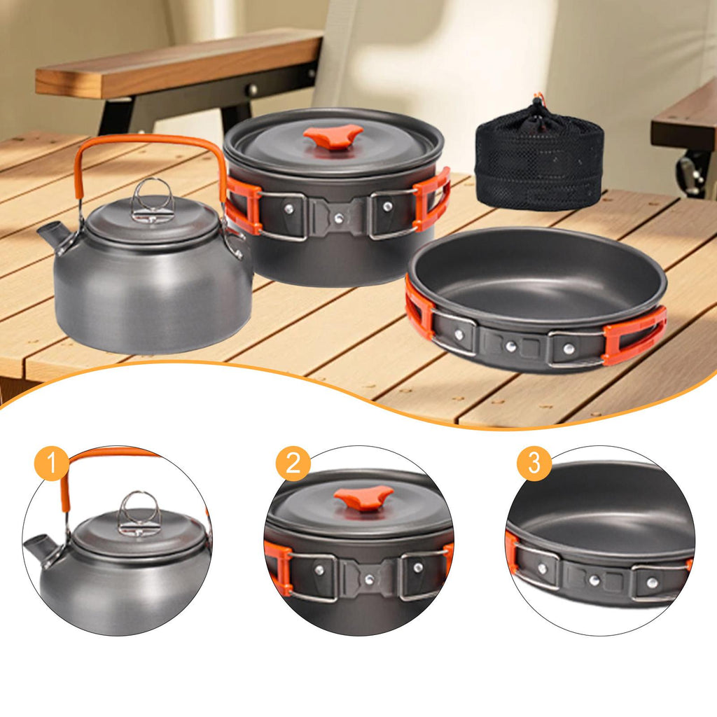 【Camping Cooking Set】: Camping cookware set for 2-3 persons, including 1 pot, 1 frying pan, and 1 kettle, meeting a variety of cooking needs