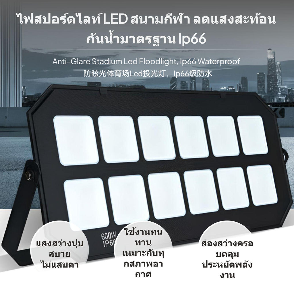 【ไฟสปอร์ตไลท์ light-emitting diode กำลังสูงสำหรับกลางแจ้ง】ไฟสปอร์ตไลท์ light-emitting diode 600W นี้เหมาะสำหรับสนามบาสเกตบอล สนามฟุตบอล โรงงาน และพื้นที่กลางแจ้งขนาดใหญ่ ให้แสงสว่างขาวนวล สว่างมากและไม่แสบตา ด้วยดีไซน์ป้องกันสายตาและกระจกนิรภัยหนา ทนทานต่อทุกสภาพอากาศ【กันน้ำและกันฝุ่นระดับ IP66】ไฟสนาม light-emitting diode รุ่นนี้มีคุณสมบัติกันน้ำและกันฝุ่นระดับสูง เหมาะสำหรับใช้งานกลางแจ้งในฤดูฝนหรือพื้นที่ที่มีฝุ่นมาก ให้ความปลอดภัยและความมั่นใจในการใช้งาน【วัสดุอลูมิเนียมหนาและกระจกนิรภัย】โครงสร้างแข็งแรงด้วยอลูมิเนียมหนาและกระจกนิรภัย ช่วยป้องกันแรงกระแทกและยืดอายุการใช้งาน เหมาะสำหรับติดตั้งในสนามกีฬา โรงงาน หรือพื้นที่ที่ต้องการความทนทาน【ประหยัดพลังงานและแสงสว่างสูง】ใช้ชิป light-emitting diode คุณภาพสูง ให้แสงขาวสว่างมาก ประหยัดพลังงานและไม่กระพริบ เหมาะสำหรับงานติดตั้งที่ต้องการความสว่างต่อเนื่องและประหยัดค่าไฟ【ติดตั้งง่ายและใช้งานได้หลากหลาย】เหมาะสำหรับสนามบาสเกตบอล สนามฟุตบอล โรงงาน ถนน หรือภูมิทัศน์กลางแจ้ง ติดตั้งง่ายและรองรับแรงดันไฟฟ้า 220V-240VSpecification: