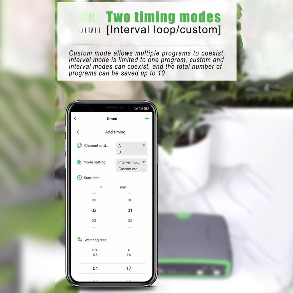【Two Timing Modes】: Choose between interval cycling and custom modes for scheduling. The custom mode supports multiple programs simultaneously, while the interval mode allows 1 program at a time. Both modes can coexist with a total of up to 10 programs saved